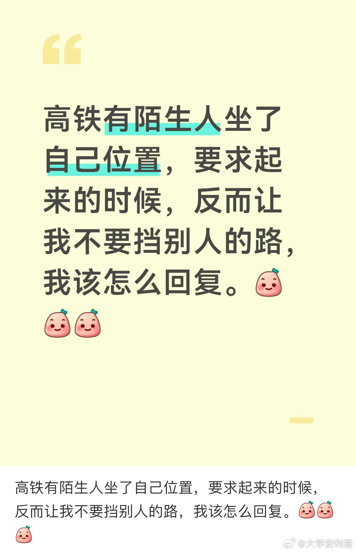 高铁有陌生人坐了自己位置,要求起来的时候,反而让我不要挡别人的路,我该怎么回复