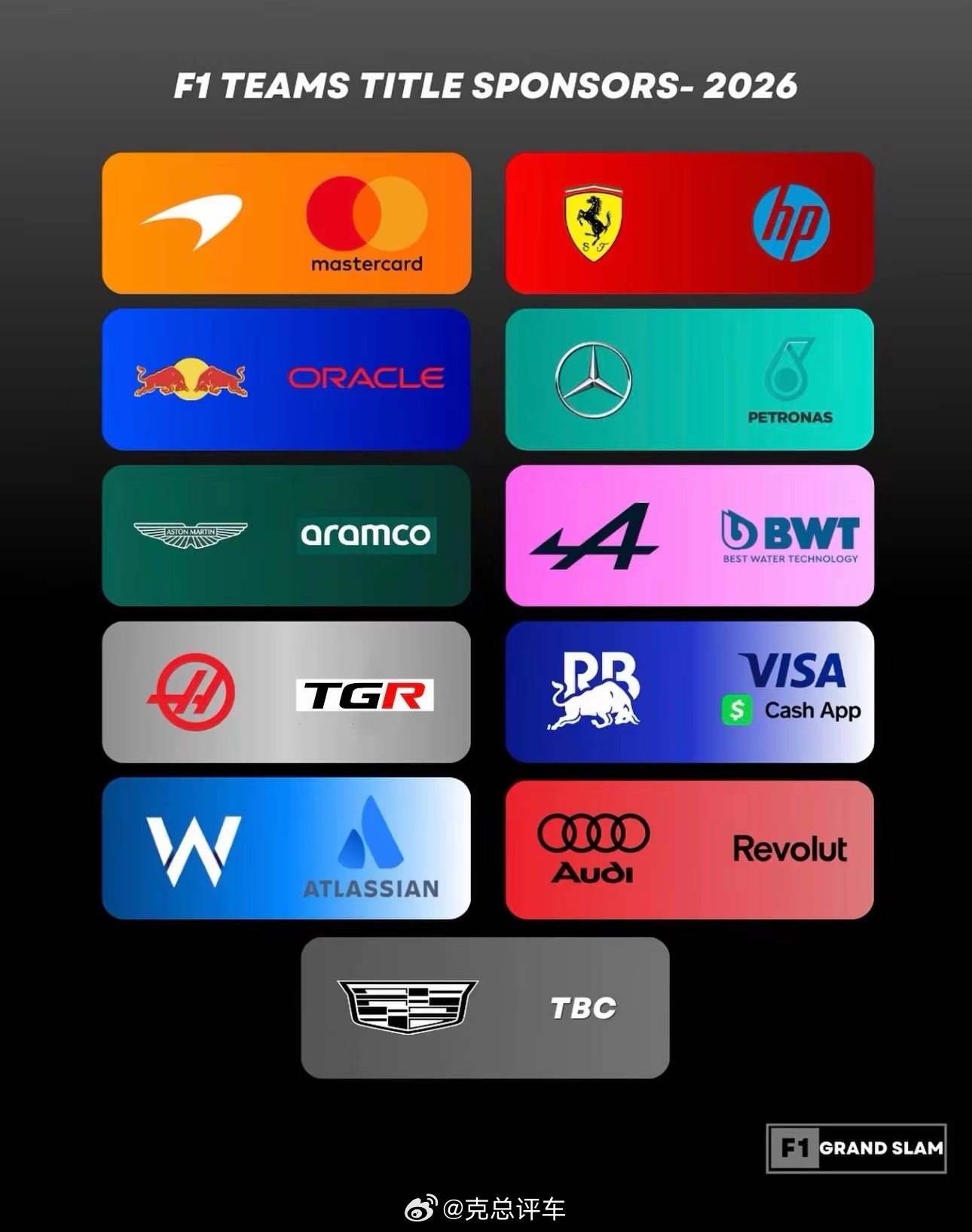 2026年F1 各车队冠名商赞助费甲骨文(红牛):1.1 亿美元惠普(法拉利):1 亿美元万事达卡(迈凯伦):9000万美元马石油(梅赛德斯):8000万美元Revolut(奥迪):7500万美元沙特阿美(阿斯顿马丁):7500万美元Visa Cash App(小红牛):5000万美元Atlassian(威廉姆斯):4000万美元BWT(Alpine):2500万美元Toyota(哈斯):2000万美元凯迪拉克车队:暂无相关数据