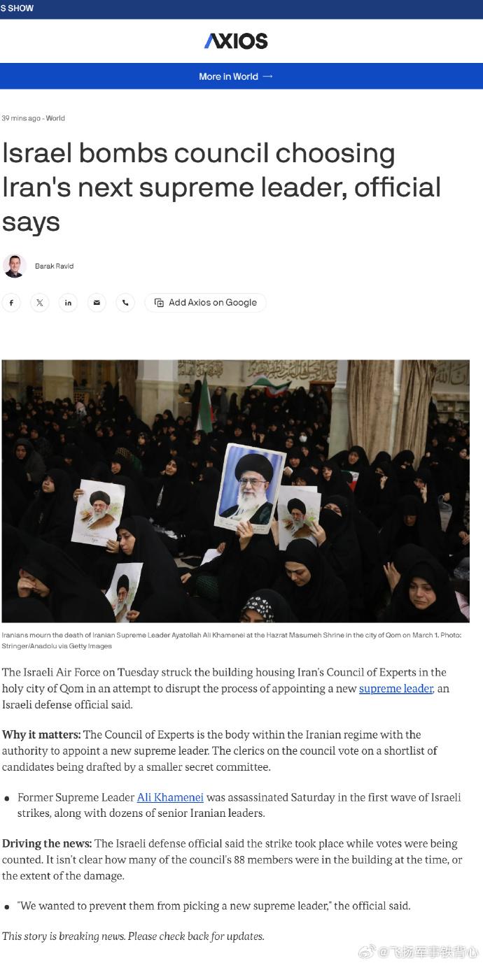 以色列空军轰炸了正在选举新领导班子的伊朗专家会议现场,据称伤亡重大--- 原文作者署名: 记者苏海卜·马萨勒马——专家、分析师、翻译 伊朗专家会议在库姆市举行会议期间遭到袭击。相关信息显示,阿亚图拉穆罕默德·阿里·穆瓦赫迪·克尔马尼及其两名副手——哈希姆·侯赛尼·布什赫里和阿里·礼萨·阿尔菲——可能在袭击中遇害。阿尔菲同时被视为潜在候选人之一,并且是2026年3月1日成立的过渡领导委员会成员。 伊朗专家会议与伊朗伊斯兰协商会议(议会)当时正在进行新任最高领袖的选举,现场共有88名重要人物出席。 在计票过程中,大楼遭到打击并被摧毁,所有人员遇难。 这是一场规模巨大且极具戏剧性的行动。 AXIOS报道(图二): 官员称以色列轰炸负责选举伊朗下一任最高领袖的委员会大楼 作者:巴拉克·拉维德 以色列一名国防官员表示,以色列空军周二对位于圣城库姆的伊朗专家会议(Council of Experts)所在建筑实施打击,试图扰乱任命新任最高领袖的进程。 为何重要: 专家会议是伊朗政权体系内有权任命新最高领袖的机构。该委员会中的神职人员将对一个由更小型秘密委员会拟定的候选人短名单进行投票表决。 前最高领袖阿里·哈梅内伊在周六以色列首轮打击中遭到暗杀,与数十名伊朗高级领导人一同身亡。 事件进展: 这名以色列国防官员称,空袭发生在计票期间。目前尚不清楚当时88名委员中有多少人在楼内,也不清楚建筑受损程度。 “我们希望阻止他们选出新的最高领袖,”该官员表示。 本报道为突发新闻,后续将持续更新。
