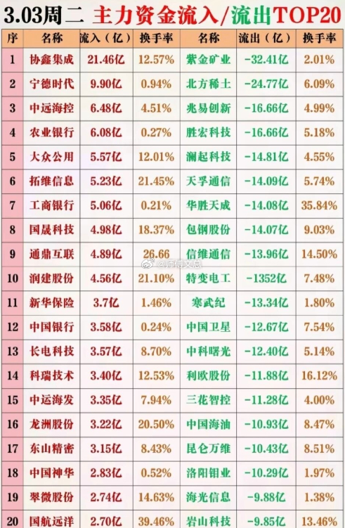 3月3日周二收盘数据重磅出炉,主力资金层面,协鑫集成以21.46亿净流入领跑,宁德时代、中远海控紧随其后,光伏、航运、银行板块获资金重仓。