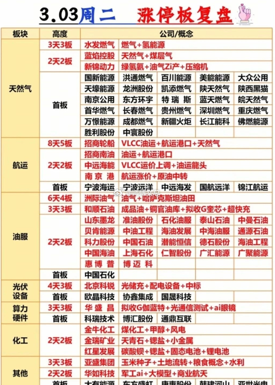 涨停板复盘显示,天然气、航运、油服板块成涨停主力军,招商轮船8天5板强势领跑,天然气板块多股连板……