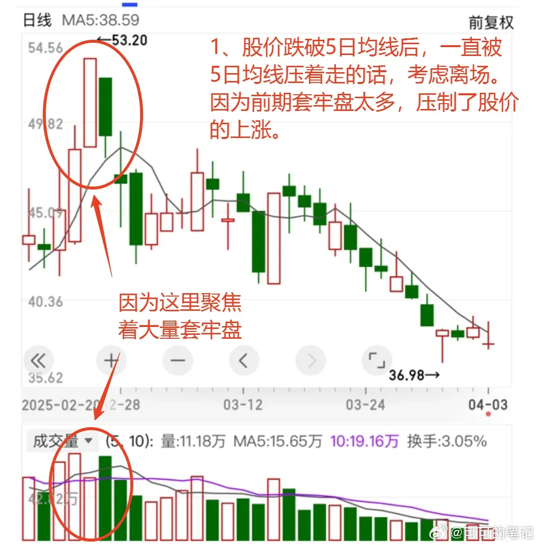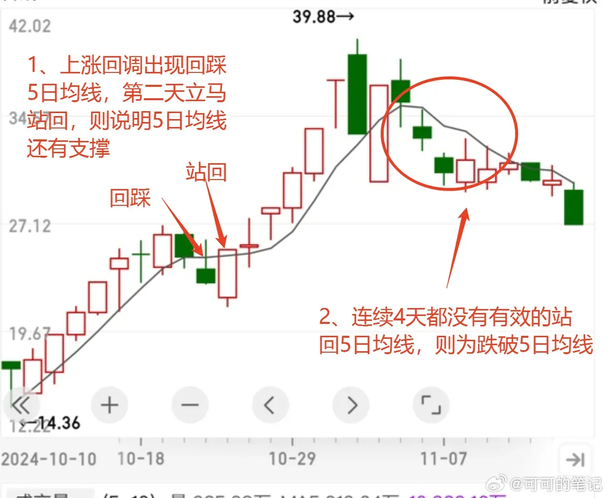 通过5日均线把握进场和离场点。5日均线是做短线最为常用的一根均线,运用好它的几种用法,能够很好的把握住进场点和离场点。下面通过几个案例介绍其用法:第一个用法的核心操作:当股价连续快速上涨,导致其K线偏离5日均线很大,这个时候需要注意风险(妖股除外,即那种市场关注度极高的个股),如图一所示,当K线远离5日均线后出现了一波回调,使股价重回5日均线附近。那么偏离多少呢,有一个指标叫乖离率。一般乖离率大于7%,则要注意风险了。其乖离率计算公式:乖离率=[(当日收盘价-5日平均价)/5日平均价]*100%第二个用法的核心操作:个股在上涨趋势中,如果出现回踩,但是没有有效跌破5日均线,则说明5日均线有支撑。如图二箭头位置一所示,在上涨过程中出现了回踩,其收盘价已经跌破了5日均线,但是第二天直接站回了5日均线,说明没有跌破5日均线。而图二箭头位置2所示,连续四天都在5日均线下,则说明有效跌破了5日均线。第三个用法的核心操作:如果个股跌破5日均线后,一直没有重新有效的站回5日均线,则考虑离场。说明此前的套牢盘使5日均线对股价产生了压制。如图三所示。a股A股