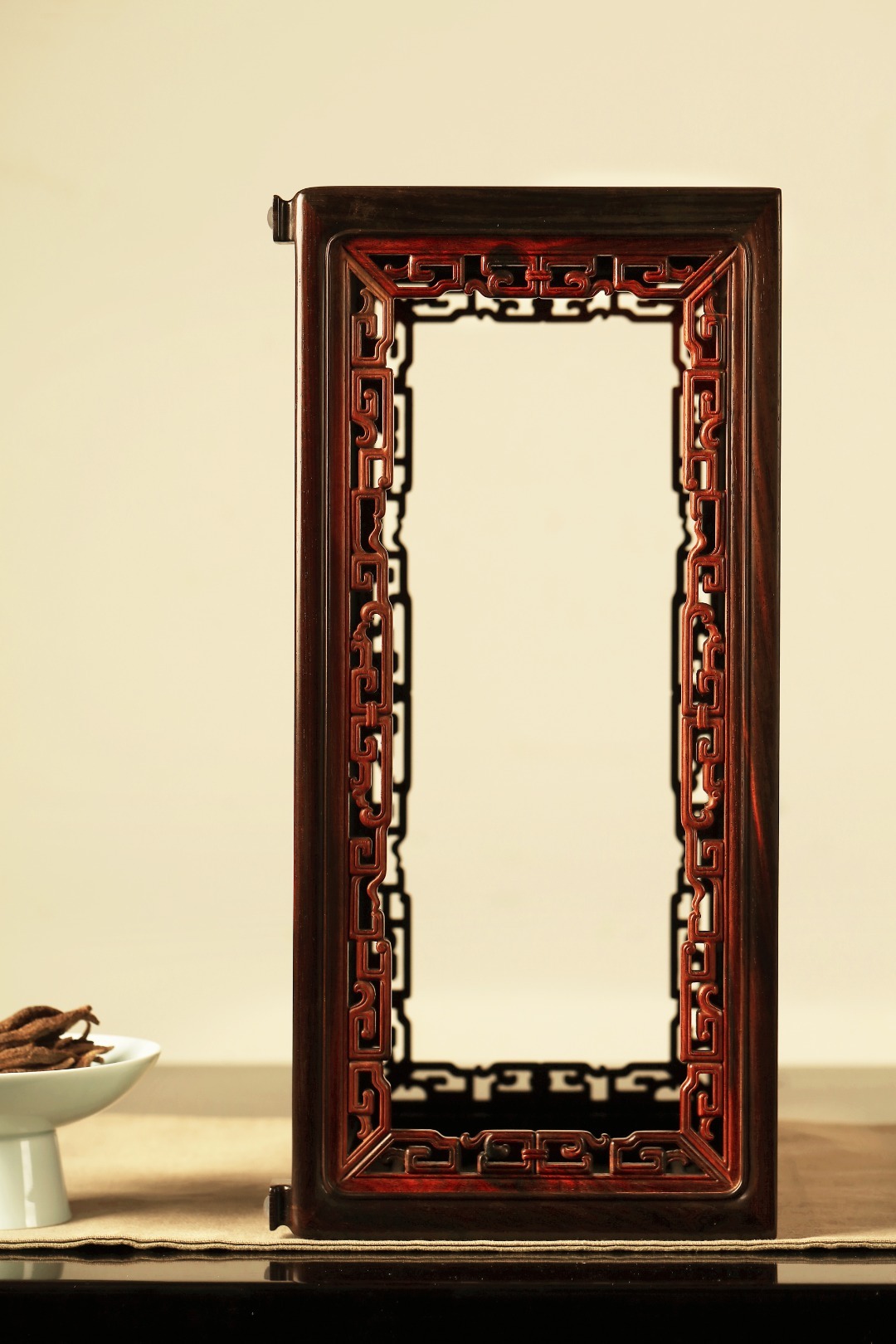 取材老料大红酸枝,上下双面独板。榫卯攒嵌,牙板大红酸枝红料撞色,透雕拐子龙纹。柱料通根下起内倭脚,美观牢固。内镗空间大,收纳各类茶器,陈列雅玩珍物,恰宜雅室清居点睛之笔。