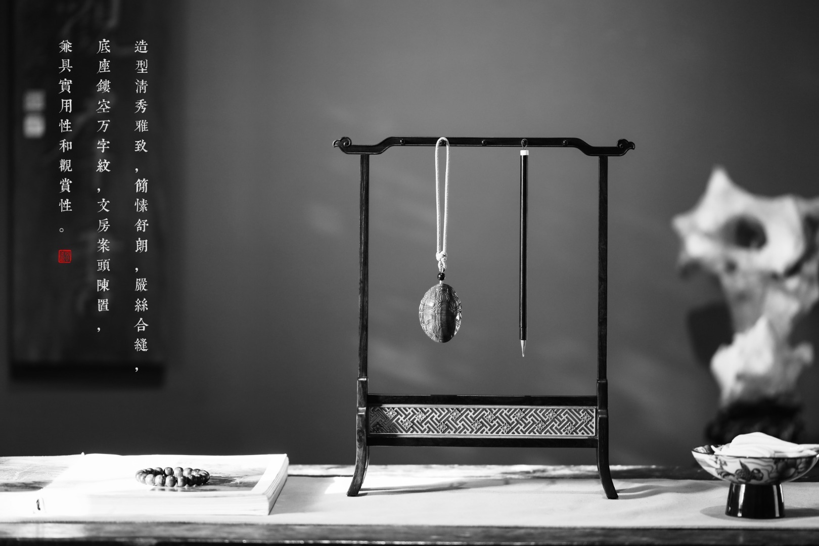 造型清秀雅致,简愫舒朗,严丝合缝,底座镂空万字纹,文房案头陈置,兼具实用性和观赏性。