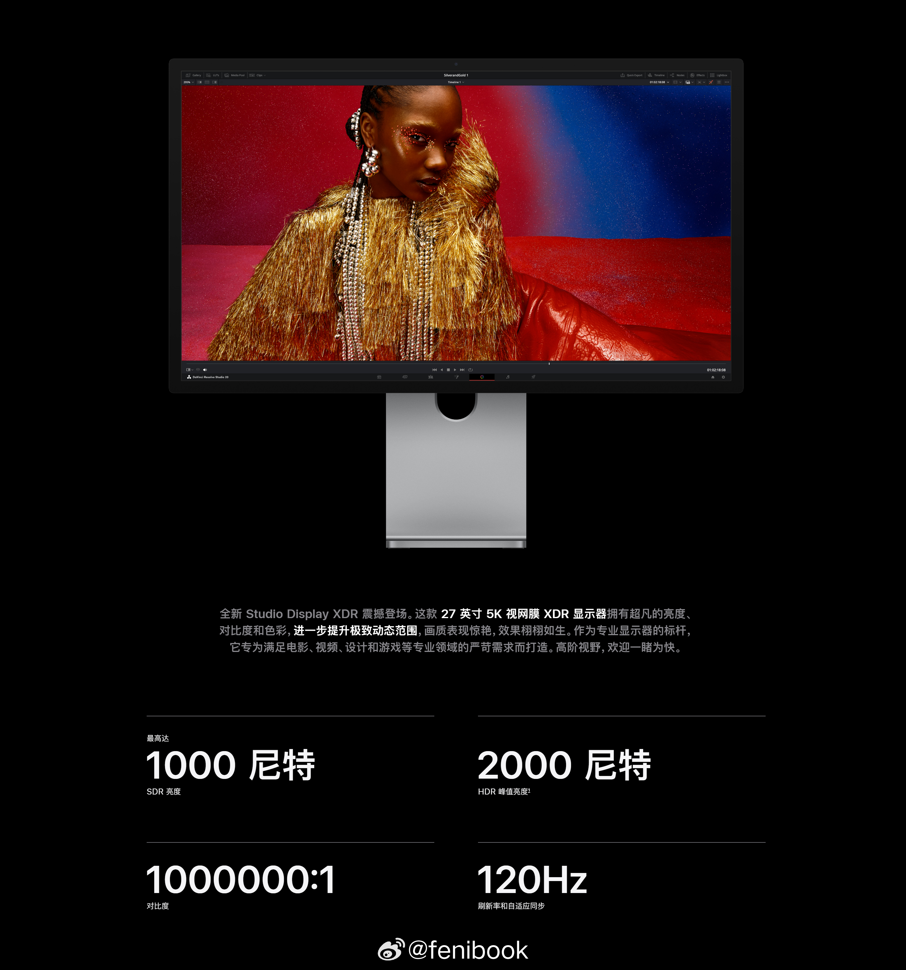 4年!4年了!苹果终于发布了Studio Display XDR,高刷和HDR全给了,27英寸5K屏幕,2304分区背光mini-LED,1000nit SDR亮度,2000nit HDR亮度,高保真六扬声器,支持杜比全景声和空间音频,两个雷雳5接口➕两个10Gb/s的C口,仅售24999人民币