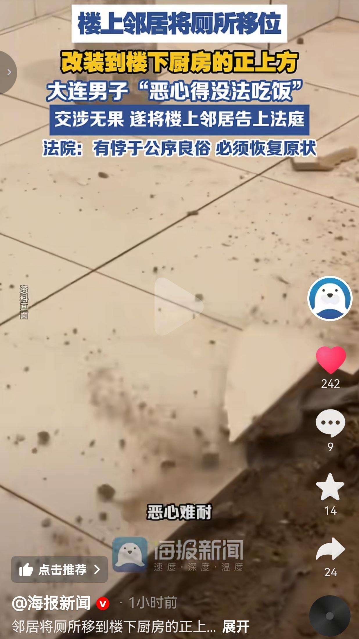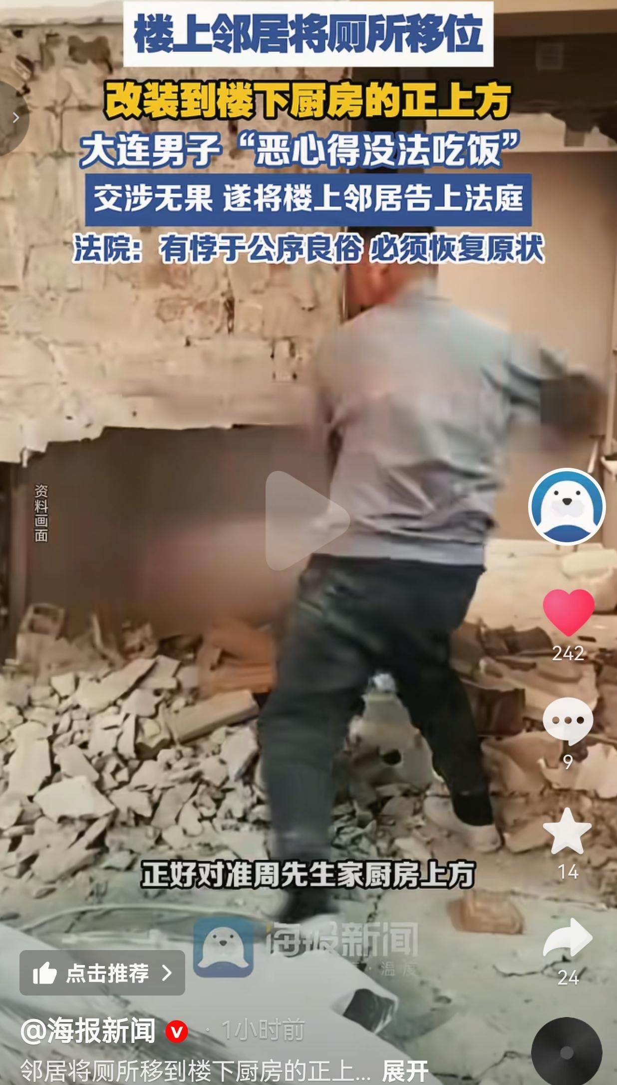 离大谱了!近日,辽宁大连的周先生,最近遇上了一件让他恶心到吃不下饭的事。 他和楼上的柳先生,是做了30年的老邻居。30年啊,抬头不见低头见,平时谁家做了好吃的,都会端一碗过去,关系一直不错。 可谁能想到,就是这位老邻居,在三年前装修的时候,干了一件让他彻底寒心的事。 三年前,柳先生家装修,周先生当时也没多想,觉得都是老邻居了,肯定不会有什么问题。 可没过多久,周先生家的厨房就开始时不时地漏水,天花板上的腻子都泡得发皱、往下掉。 他一开始还以为是自己家水管出了问题,找了师傅来修,折腾了半天也没找到原因。 直到后来,他实在忍无可忍,上楼去找柳先生沟通,才从对方嘴里听到了一个让他五雷轰顶的消息:柳先生在装修时,竟然擅自把自家的厕所移位,改到了原来厨房的位置——而这个位置,正好就在周先生家厨房的正上方! 周先生说:“听到这个消息,我当时整个人都懵了,我家炒菜做饭的地方,头顶上就是他家的厕所?这谁能受得了啊!” 从那以后,周先生每次走进厨房,脑子里就忍不住浮现出楼上马桶冲水的画面,连吃饭都觉得反胃。 他只能端着碗躲去卧室吃,好好的一日三餐,硬生生变成了“躲着吃”,生活被搅得一团糟。 他多次找柳先生交涉,要求对方把厕所恢复原状,可柳先生要么避而不见,要么就说“我家装修我做主,你管不着”,甚至在法院勘察确认虽无渗漏后,依然拒绝恢复原状。 30年的老邻居情分,平时关系很好,却因为这一件小事,碎得连渣都不剩。 多次沟通无果后,周先生终于下定决心,一纸诉状把柳先生告上了法庭。他说:“我不是想把关系闹僵,我只是想讨回一个公道,我只是想安安心心做顿饭、吃顿饭。” 法院审理后认为,柳先生擅自改动卫生间位置与主下水管,将厕所移位至楼下厨房正上方的行为,不仅违反了住宅设计规范,更有悖于公序良俗,对周先生的正常生活造成了严重影响。 依据《民法典》相关规定,最终判决:柳先生必须在60日内,将厕所恢复到原来的位置。 这个判决一出,网友们都炸了,纷纷拍手称快,有的网友说:“干得漂亮!这厕所搁谁头顶上都得疯!” 也有的网友说:“30年老邻居又怎样?做人不能太自私!” 还有的网友说:“支持周先生,这不是矫情,是底线问题!” 我们总说“远亲不如近邻”,邻里关系是我们生活中最温暖的纽带之一。可偏偏有些人,为了自己的一点方便,就把别人的感受踩在脚下,把几十年的情分当成空气。 柳先生可能觉得,不就是挪个厕所吗?多大点事。可他忘了,那不是他一个人的房子,那是一整栋楼,是大家共同的家。他的“方便”,是建立在别人的“恶心”之上的。 这件事也给我们所有人提了个醒: 装修不是私事:任何涉及房屋结构、管道布局的改造,都必须遵守相关规定,更要考虑到对楼下、对邻居的影响。 公序良俗是底线:有些事,就算法律没明确禁止,也不能干。因为它违背了人之常情,突破了大家公认的道德底线。 别把别人的容忍当成理所当然:老邻居的包容,不是你肆意妄为的资本。当你把别人逼到忍无可忍的时候,就算你们之间的情分再好,也救不了你。 针对此事,你有什么看法呢?欢迎大家评论区讨论留言。