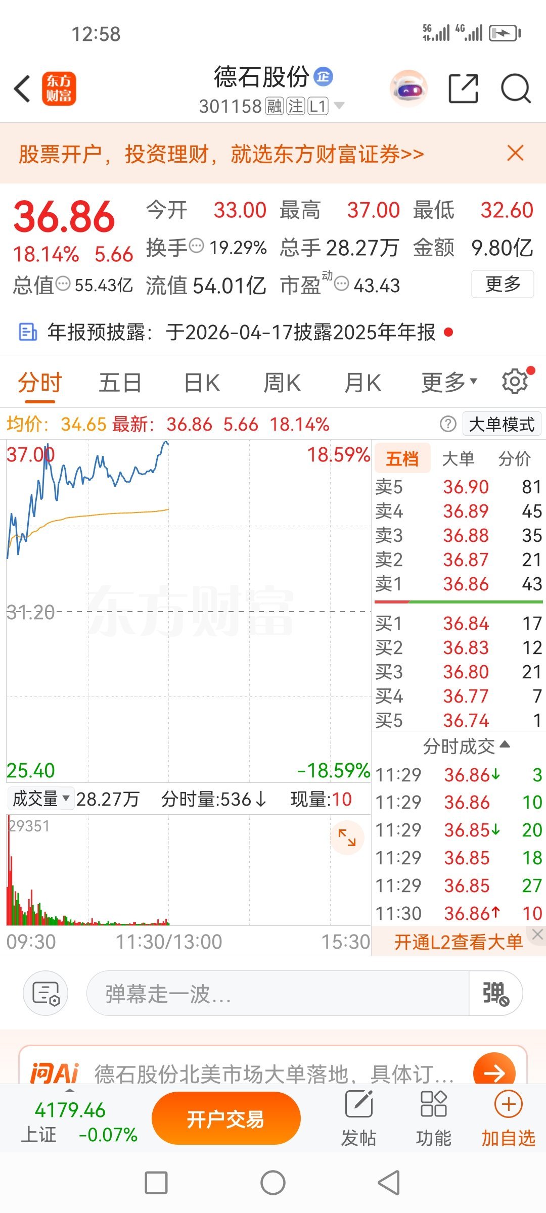 没想吧?今天行情那么差,盘前分享的德石股份301158既然如此猛烈,一不小心就1