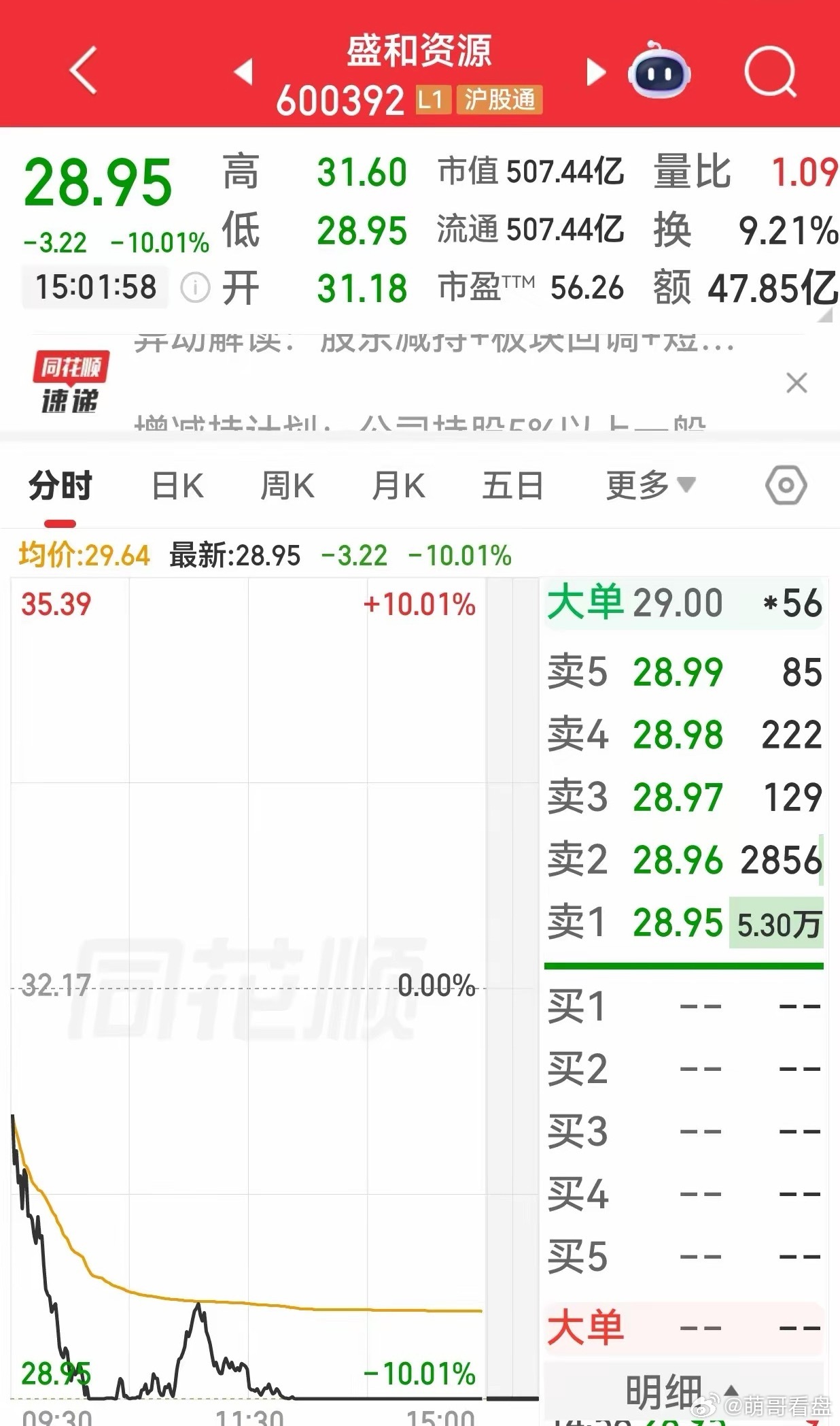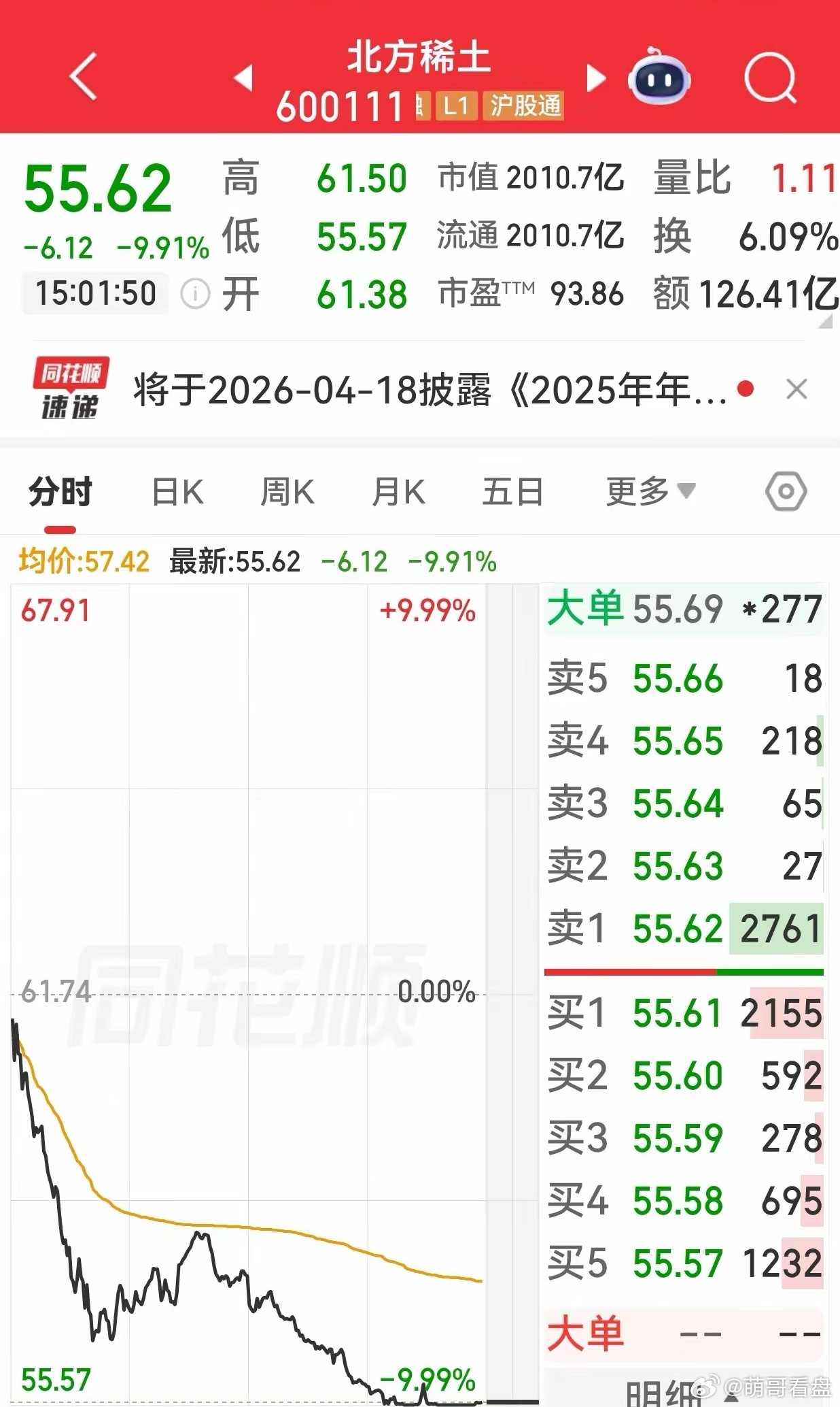 四大稀土股票几乎全部跌停!1 北方稀土,跌9.91%2 中国稀土,跌9.53%3 盛和资源,跌10.01%4 中稀有色,跌10%