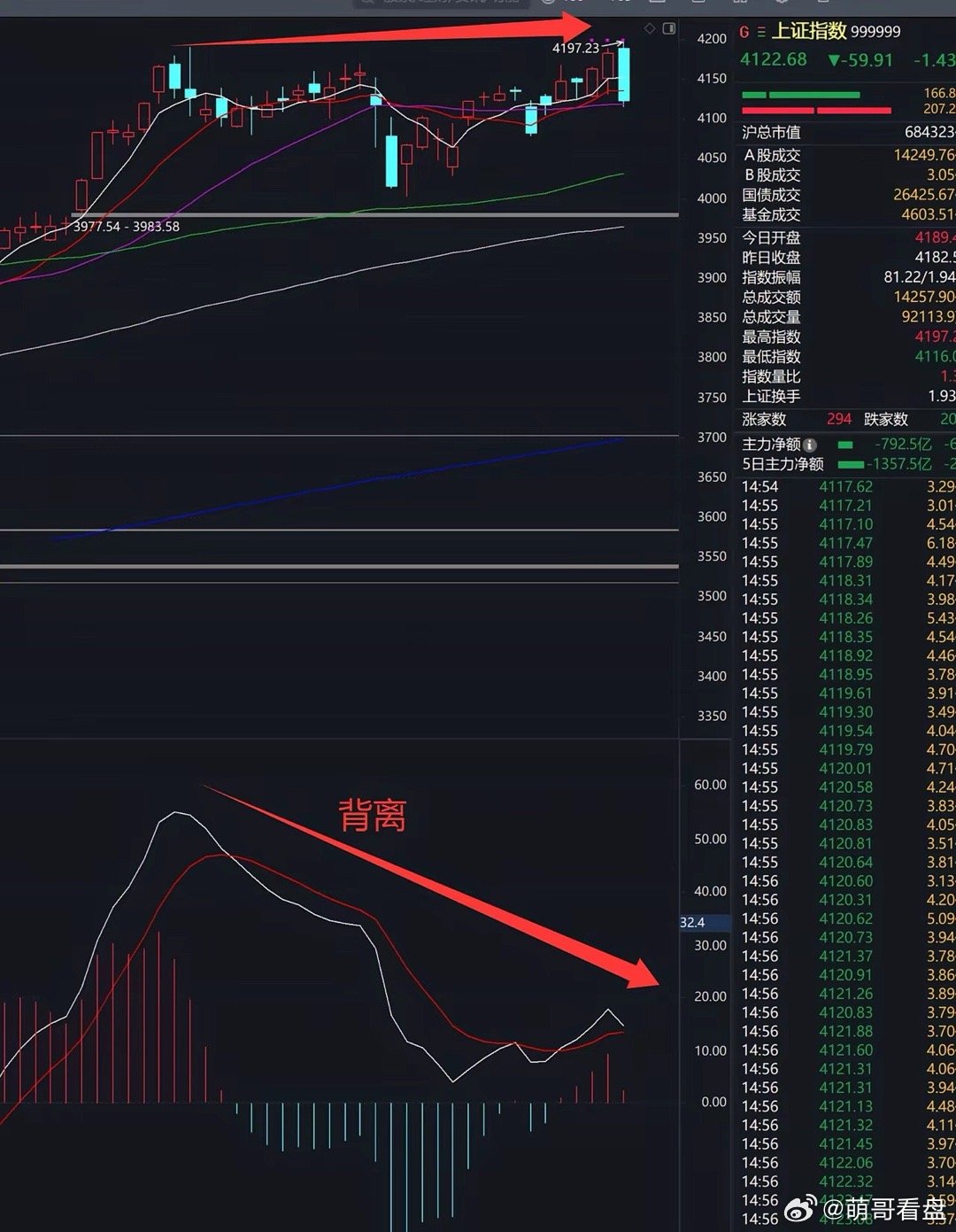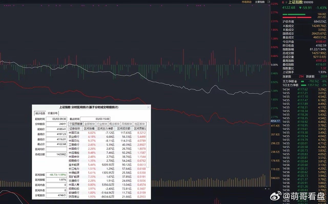 平均股价暴跌近 4%,开年利润全回吐!A股全天放量下跌,平均股价暴跌3.99%,一根大阴线几乎把开年的上涨全抹了,4800多家下跌,82家跌停,5%以上跌幅高达1500多只,又又又非常悲壮的一天!早盘其实还有点小希望,上证靠着石油、海运这些避险板块,短暂创下新高,可这看似强势的背后,早已暗藏杀机——日线级顶背离,妥妥的下跌信号!10点20分左右,大金融(银行、保险、券商)紧急护盘,沪指直接V型反转,本以为能救市,结果坑来了!平均股价压根没跟着回升,这护盘从一开始就透着猫腻!首先是护盘力量出现后,明显诚意不足,就比如既然想拉券商,却连一只涨停股都没有。ETF上面没有看到有放量迹象,可以说只是试探性的护盘,纯属走个过场!果然,下午一开盘,抛压直接炸了!指数、个股单边加速下跌,恐慌盘疯狂涌出,那些试探性护盘的资金,直接被埋得明明白白!再看资金方面,陆股通资金开盘后就开始净卖出,全天净卖出高达1500亿,而且看沪深方向几乎一条线重合,属于强势做空模型!这个净流出幅度仅次于924那波10月8日的1800亿!有护盘但不多,恐慌盘涌现,盘面看似挺不乐观!不过也别慌,护盘咱A哥这边比较有经验,这不最近几乎每年都有这样的极端考验么,经验比较丰富。以往的经验都证明,稳住中小创才是破局关键!剩下的就是看看大哥出不出手了,稳不稳中小创,总不能每次都是别人消费,咱A公子买单吧!