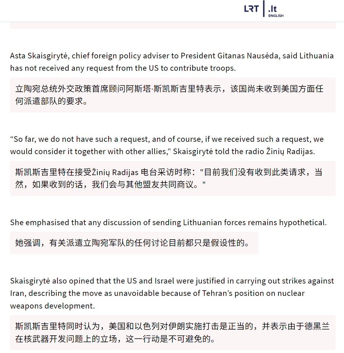 🔻立陶宛总统顾问表示,若美国请求,立陶宛将考虑协助其对伊朗作战,甚至可能派遣部队。🔻立陶宛总统外交政策首席顾问阿斯塔·斯凯斯吉里特同时表示,该国尚未收到美国方面任何派遣部队的要求。她强调,有关派遣立陶宛军队的任何讨论目前都只是假设性的。🔻立陶宛军队规模较小,是波罗的海三国中较典型的小国军队,主要依赖北约集体防御,2026年国防预算达到创纪录的€4.79亿欧元,占GDP约5.38%,但总现役军人不过1–2万人。🔻立陶宛高度依赖美国/北约的安全保障(尤其面对俄罗斯威胁),其国防政策核心是“忠诚于盟主”。这种“随时准备帮忙,哪怕是去打伊朗”的表态,更像是向华盛顿表忠心、刷存在感,尤其在“尚未收到任何请求、一切假设性”的前提下公开说“考虑派兵”,给人感觉像在“自荐”却又不敢太主动——典型的“小国舔狗”式外交,显得既急切又无力。伊朗最高领袖选举机构办公楼遭袭世界油阀关闭海外新鲜事中东现场直击