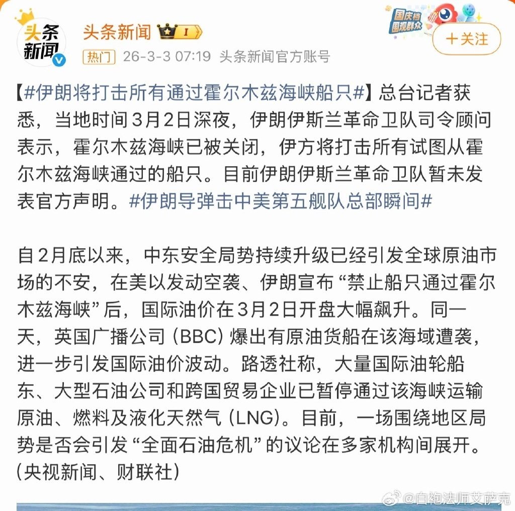 不信你们打开看看,石油相关的东西都暴涨!为什么?因为伊朗把海峡封锁了。