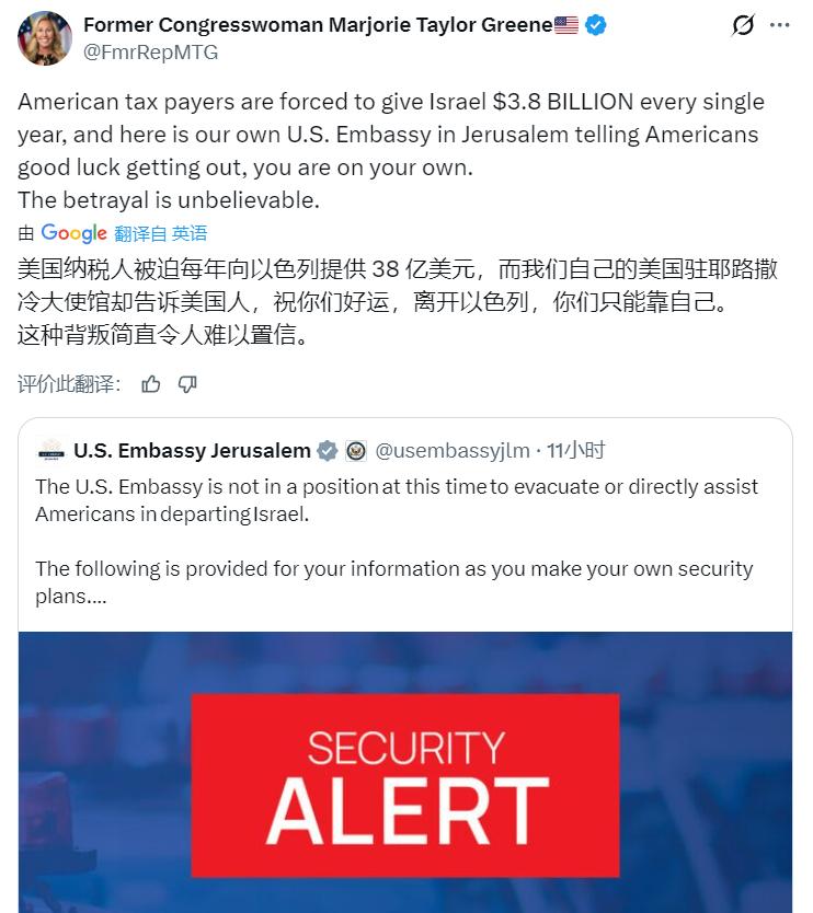 美国共和党籍议员格林:“美国纳税人被迫每年向以色列提供 38 亿美元,而我们自己的美国驻耶路撒冷大使馆却告诉美国人,祝你们好运,离开以色列,你们只能靠自己。这种背叛简直令人难以置信。”