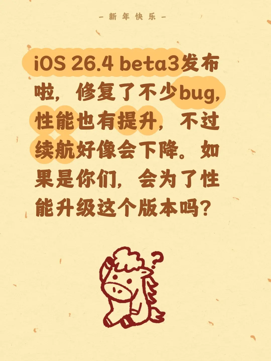 iOS 26.4 beta3发布啦,修复了不少bug,性能也有提升,不过续航好像会下降。如果是你们,会为了性能升级这个版本吗?