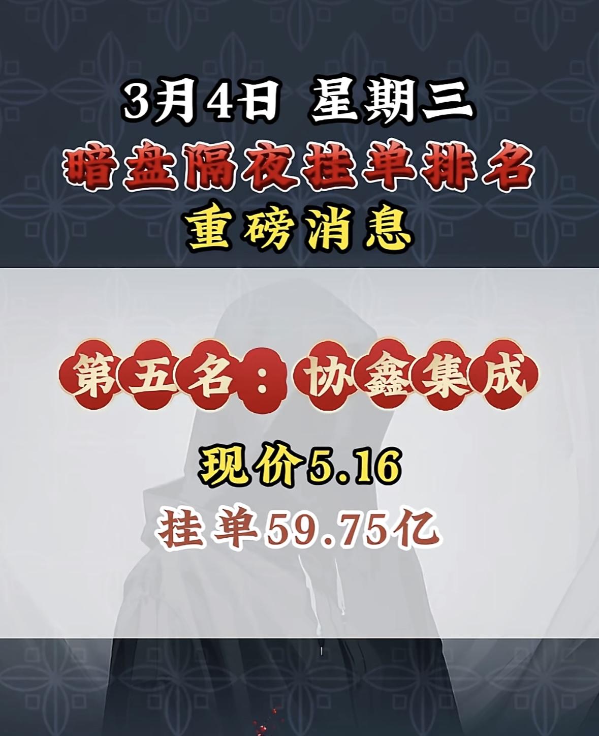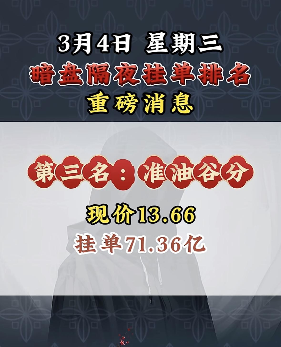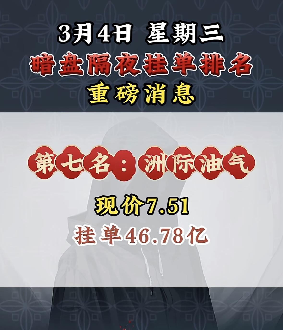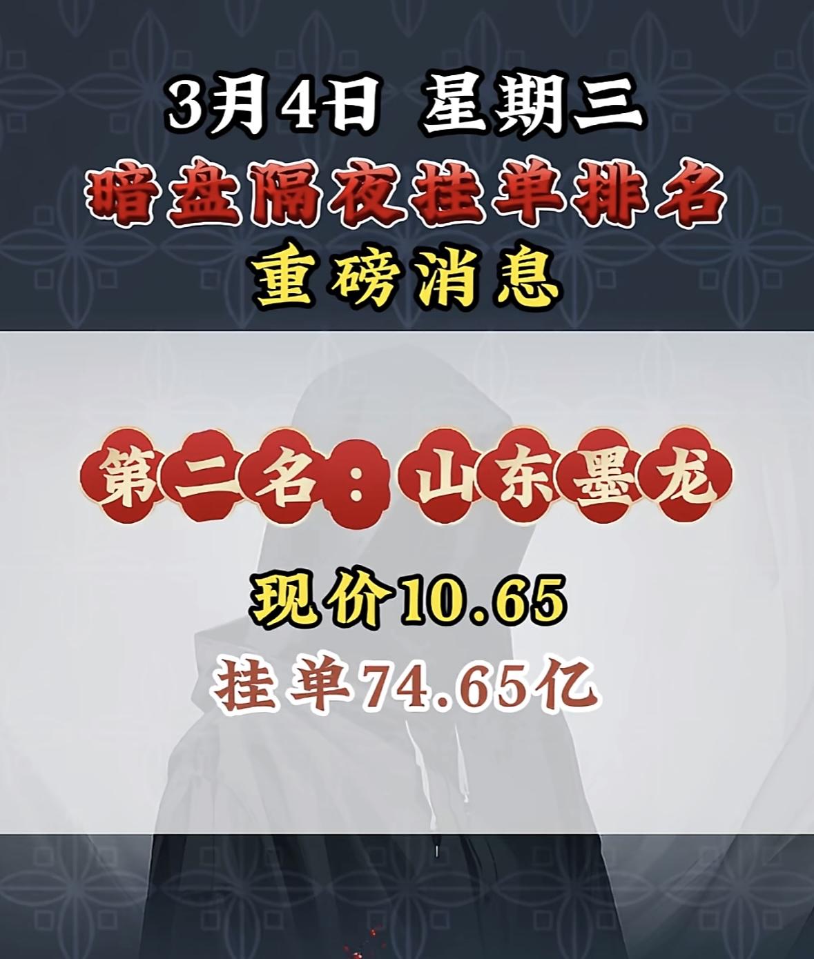 3月4日日暗盘隔夜挂单前8名个股揭晓 山东墨龙:现价10.65,挂单74.65亿,强势上榜! 中石油暗盘挂单量惊人,资金抢筹热情高涨,市场关注度飙升。