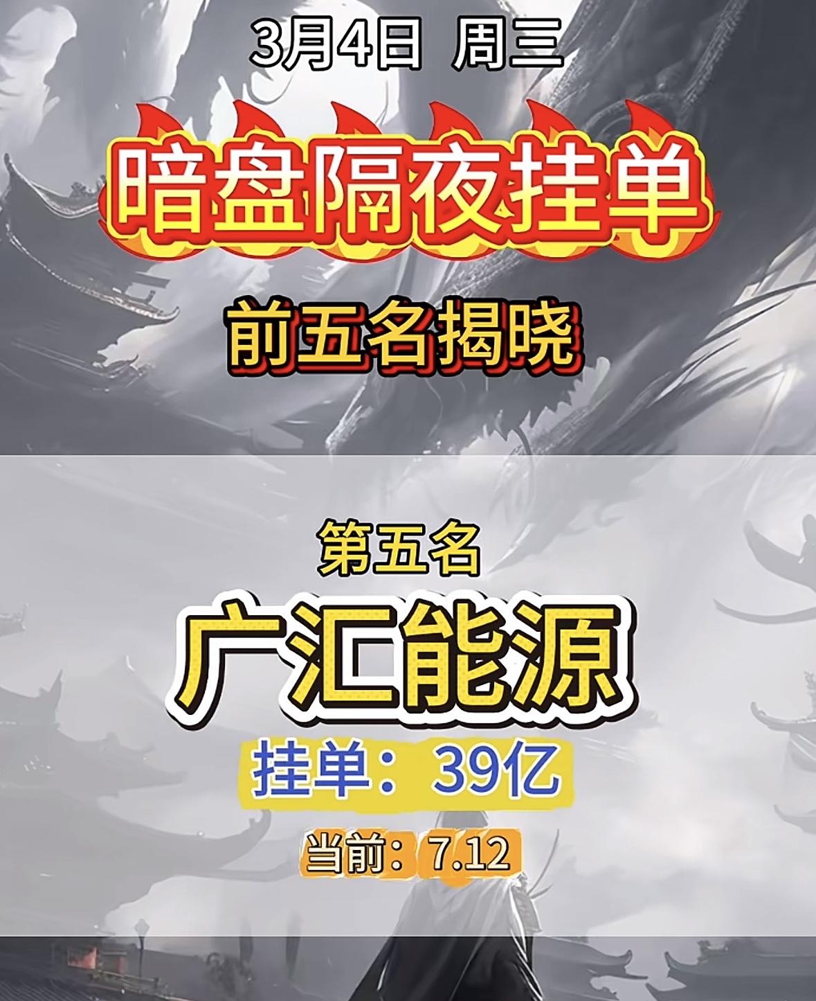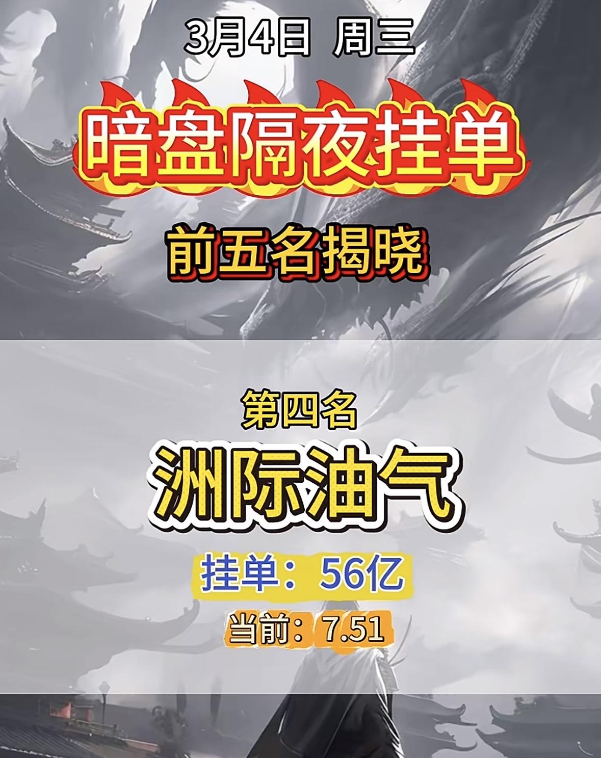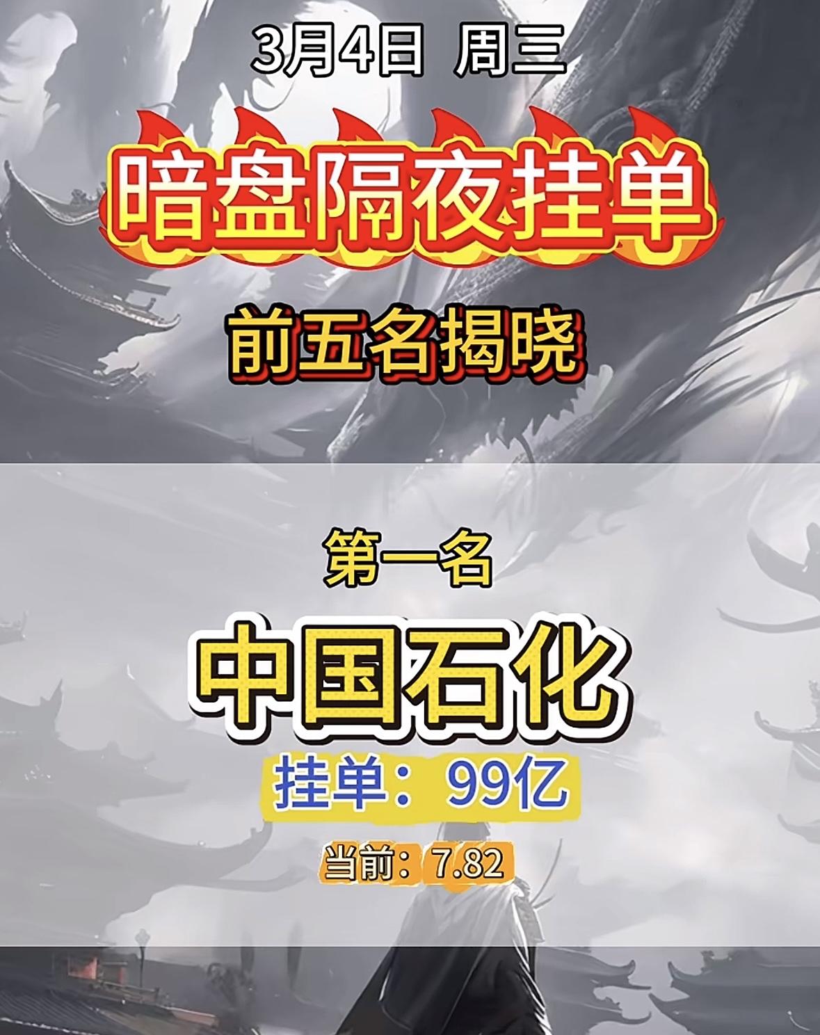 3月4日暗盘隔夜挂单,前五名揭晓。 3月4日暗盘挂单榜首揭晓,石化龙头领跑,资金动向引关注。
