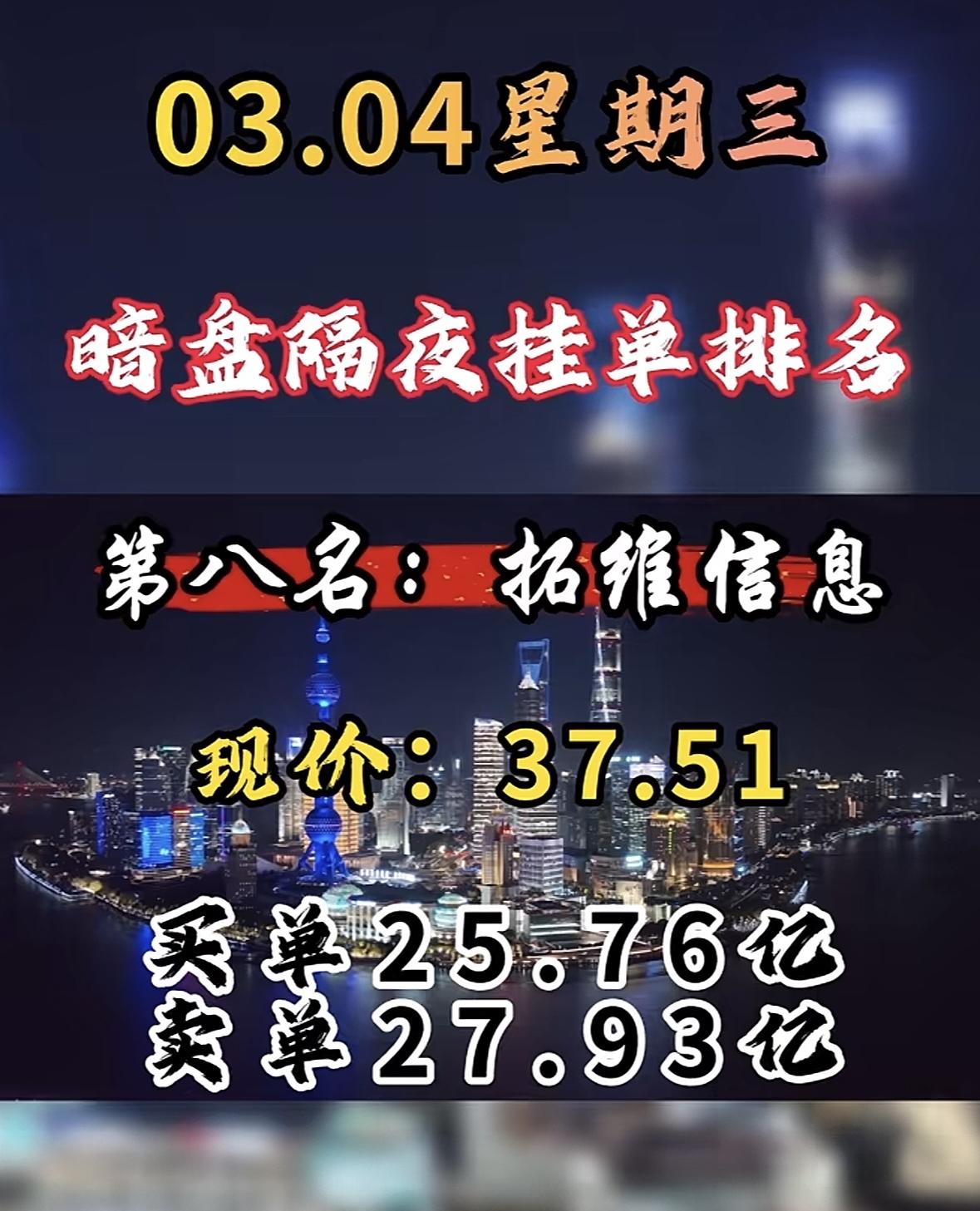 揭秘第八名: 拓维信息,现价37.51,买卖单数据大曝光! "周三洲际油气暗盘领跑,买盘强劲超卖盘,现价平稳显热度。"