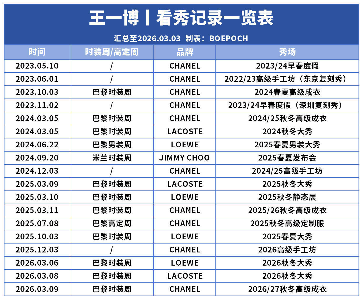 王一博王一博将参加三场大秀王一博时尚待遇太强了,王一博此次巴黎时装周最强待遇,唯一一个一次性以最高title身份集齐香奈儿、罗意威、Lacoste 共计三奢大秀的艺人,外网也全认领了。全球都没出现过跨集团代言三奢最高tittle的人!打破百年行规。2025和2026巴黎时装周创下亚洲艺人单次三奢品牌最高tittle纪录 ,同时连续两年,全球唯一打破行业百年竞业规律同时代言三大奢侈品牌的第一人!期待今年