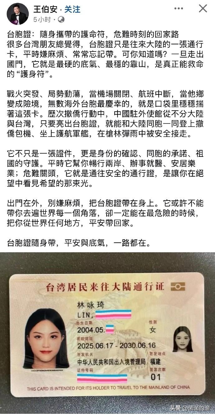 最近中东战火纷飞,中国启动撤侨行动本是护佑同胞的壮举,却因“台胞证”引发争议。岛内有人指责这是“设门槛”,甚至质疑大陆的善意。但真相是:撤侨不是请客吃饭,更不是做慈善,而是国家在危难时对公民的责任与义务。台胞证不是“阻碍”,而是打开生命通道的钥匙,是危急时刻的“救命符”! 有人问:为何非要台胞证?答案很简单——撤侨的本质是“护国人之安危”,而台胞证正是证明“你属于祖国”最直接、最合法的身份凭证。 就像美国撤侨要看护照,日本撤侨要验在留卡,中国撤侨自然需要确认同胞身份。台胞证的存在,不是给台湾同胞“添麻烦”,而是为了在混乱的战区中,以最快速度识别“自己人”,让同胞第一时间登上祖国的救援航班或车辆。 没有这道“程序”,难道要让使领馆在枪林弹雨中挨个核实身份?那不是保护,是拿人命冒险! 更荒谬的是,有人将台胞证与“政治立场”捆绑,甚至鼓吹“不拿台胞证也能撤侨”。这简直是拿生命开玩笑!试问:如果连自己是中国人都不承认,又凭什么要求中国外交资源为你“买单”?国际法明确规定,领事保护的对象只能是本国公民。 台湾是中国不可分割的一部分,台湾同胞当然是中国公民。拿着台胞证撤离,是合法、合理、合情的安排。那些拒绝台胞证却要求撤侨的人,无异于既要享受“中国人”的保护,又不愿承担“中国人”的责任——天底下哪有这样的“便宜事”? 再看现实:当战火肆虐,所谓“台湾的‘国际友人’”在哪里?当航班停飞、道路封锁,是谁第一时间派出军机军舰,打通生命通道?答案只有一个——祖国大陆。 从利比亚到也门,从尼泊尔到这次中东,每一次撤侨行动都证明:无论两岸关系如何变化,祖国始终将台湾同胞的安危放在心上。 但这份保护,必须建立在“一个中国”的原则之上,体现在台胞证这一张“护身符”之中。 说到底,台胞证不是“门槛”,而是“护盾”;不是“刁难”,而是“担当”。 它背后是祖国对同胞的牵挂,是危难时刻最坚实的依靠。那些还在纠结“证件名称”的人,不妨看看战火中的中东:当生命受到威胁时,一张能带你回家的台胞证,远比空洞的政治口号更有分量。 政治争议可以留到太平日子讨论,但救命不能等。 在子弹横飞的战区,别让无谓的争执耽误了活命的机会。承认自己是中国人,拿起台胞证,登上祖国的救援船——这才是真正对自己、对家人负责的态度。因为,无论你身在何处,只要手持台胞证,祖国就会告诉你:“别怕,我们带你回家!”