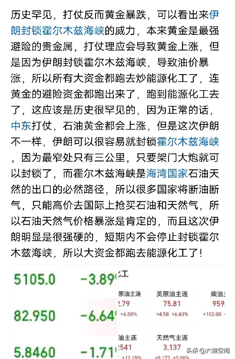 当油价涨到连黄金都开始暴跌了,就知道石油已经挤满大资金了,小玩家就不要再去凑热闹了,油价暴涨的原因是伊朗封锁霍尔木兹海峡,所以影响的就不只是美国而已,很多国家都受到影响,所以就会有人去施压或者游说伊朗解锁,同时也会被大资金利用,现在伊朗不会轻易放开,但是你不排除大资金放假消息,让油价暴涨暴跌,跟前阵子黄金一样,因为这些大宗一般都是加杠杆,而且杠杆不低,所以只要你做单的方向错了,就随时可能爆仓了,所以这个时候真的不要去碰这些东西了,万一伊朗突然又服软了,打开了霍尔木兹海峡,那你就在最高点挂着了,大资金一定比你提前知道消息的,包括这次以色列先突袭伊朗,本来川普没想打,还在谈判呢,以色列先动手了,有人就猜测,华尔街的犹太财团可能要炒油价,所以让以色列动手了,拖美国入局,所以大概率犹太财团提前买入大量石油期货了!