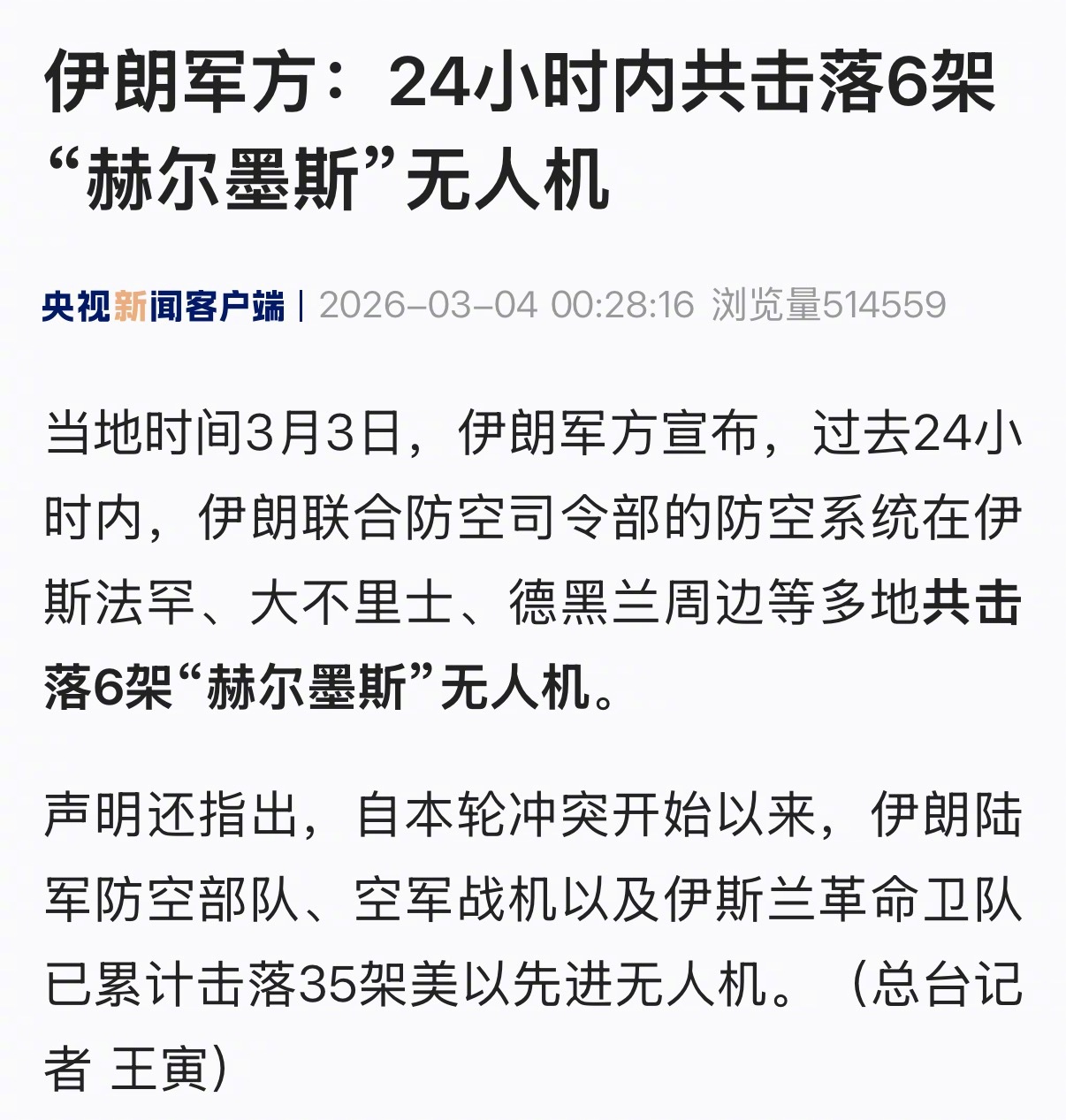 声明还指出,自本轮冲突开始以来,伊朗陆军防空部队、空军战机以及伊斯兰革命卫队已累计击落35架美以先进无人机。(央视新闻)#伊朗最高领袖选举机构办公楼遭袭##世界油阀关闭##伊朗称向美航母发射4枚巡航导弹##美以伊最新局势##伊朗南部阿巴斯港等地遭密集空袭#
