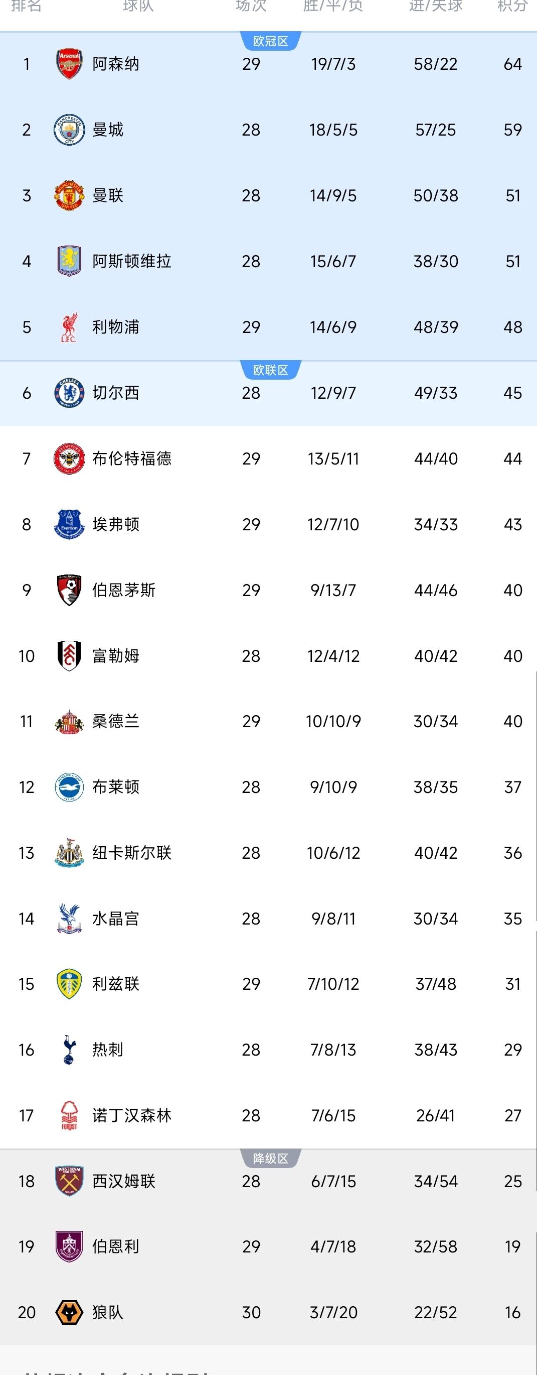 英超爆大冷,利物浦1-2惨遭垫底队绝杀! 最新积分榜出炉! 北京时间3月4日,英超联赛第29轮展开角逐。 ①布伦特福德0-0伯恩茅斯。 一场平平无奇的结果,两队交白卷,各拿1分。 ②埃弗顿2-0伯恩利。 伯恩利又输了,29轮19分,位居倒数第二,面临极大的降级风险。 ③利兹联0-1桑德兰。 毫无疑问对于利兹联较为可惜,局面占优却运气不佳,第63分钟进球被吹越位,接着禁区手球犯规送点功亏一篑。第69分钟迪亚拉点球一锤定音,升班马桑德兰客场全身而退。 ④狼队2-1利物浦。 即使利物浦局面占优,但未能在进攻端打出太多东西,制造的绝对威胁寥寥,根本无法撕开狼队的防线,上半场互交白卷,过程较为枯燥。 比赛下半场依然是漫长的僵持,直到尾声阶段才变得精彩起来,第78分钟狼队抓住转换良机,戈麦斯挺身而出完成破门,接着利物浦迅速给予回应,萨拉赫第83分钟破门扳平。 本以为又会是一场平局,结果补时狼队神兵天降,安德烈弧顶位置的远射变线入网,第94分钟2-1绝杀,这支垫底球队在赛季后程迎来爆发,连胜劲旅,燃起一定保级的希望。
