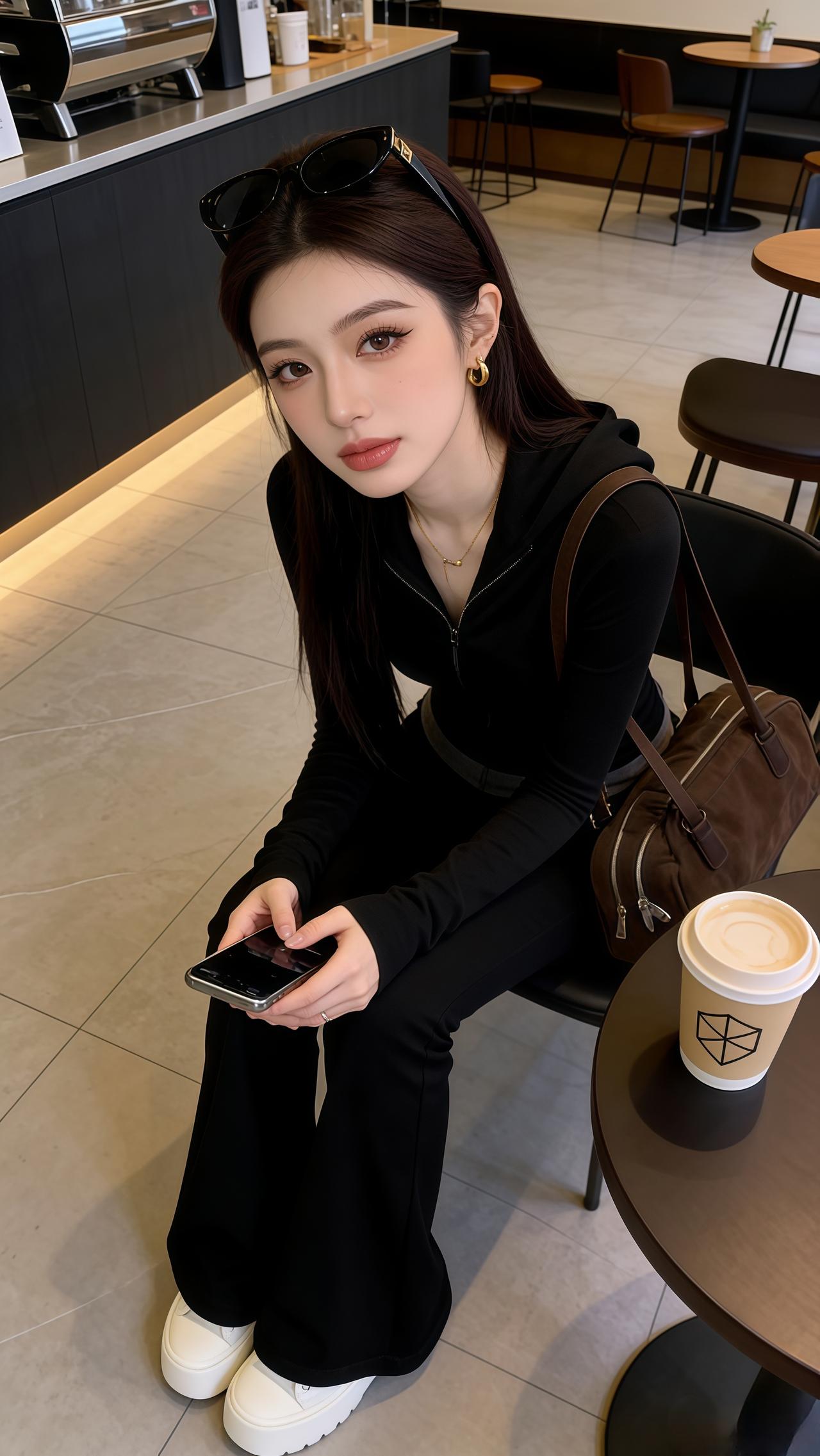 甜美少女在湖边,黑皮夹克显酷感,自然风光作背景。