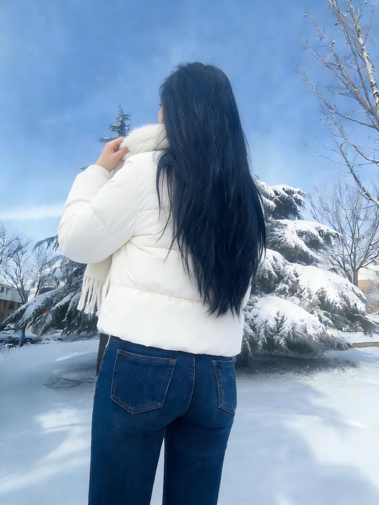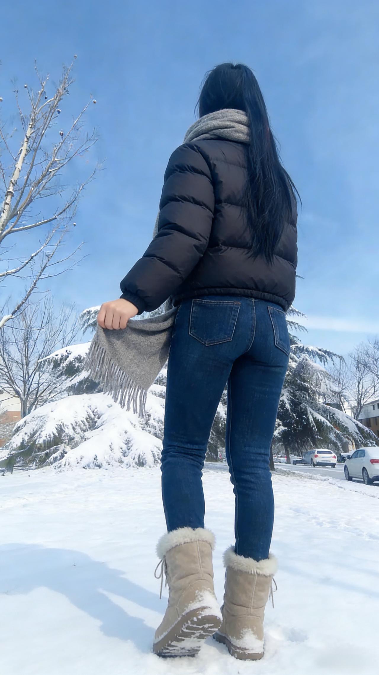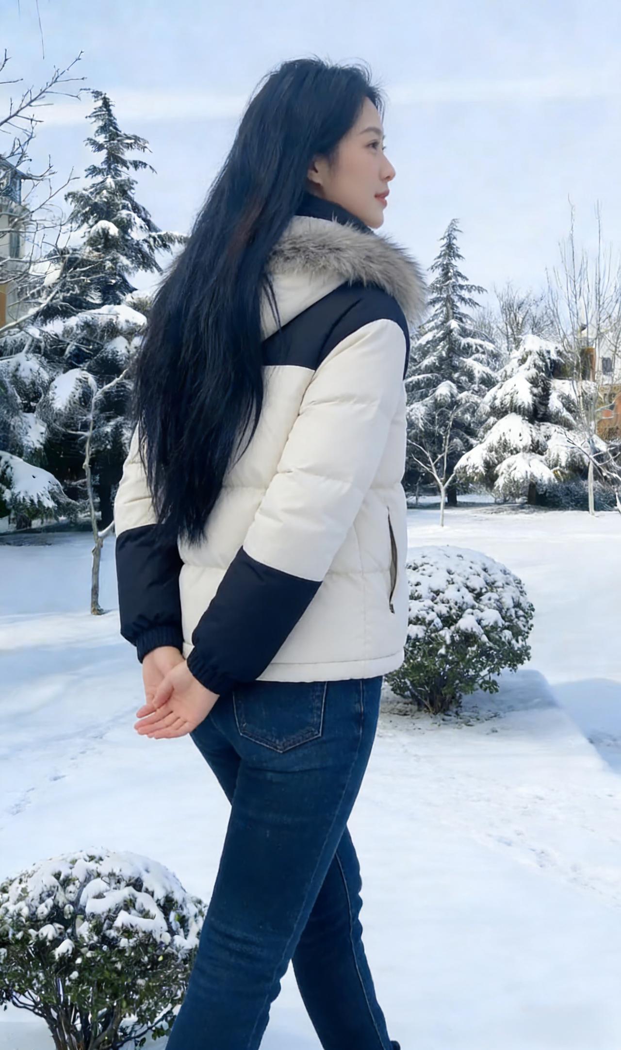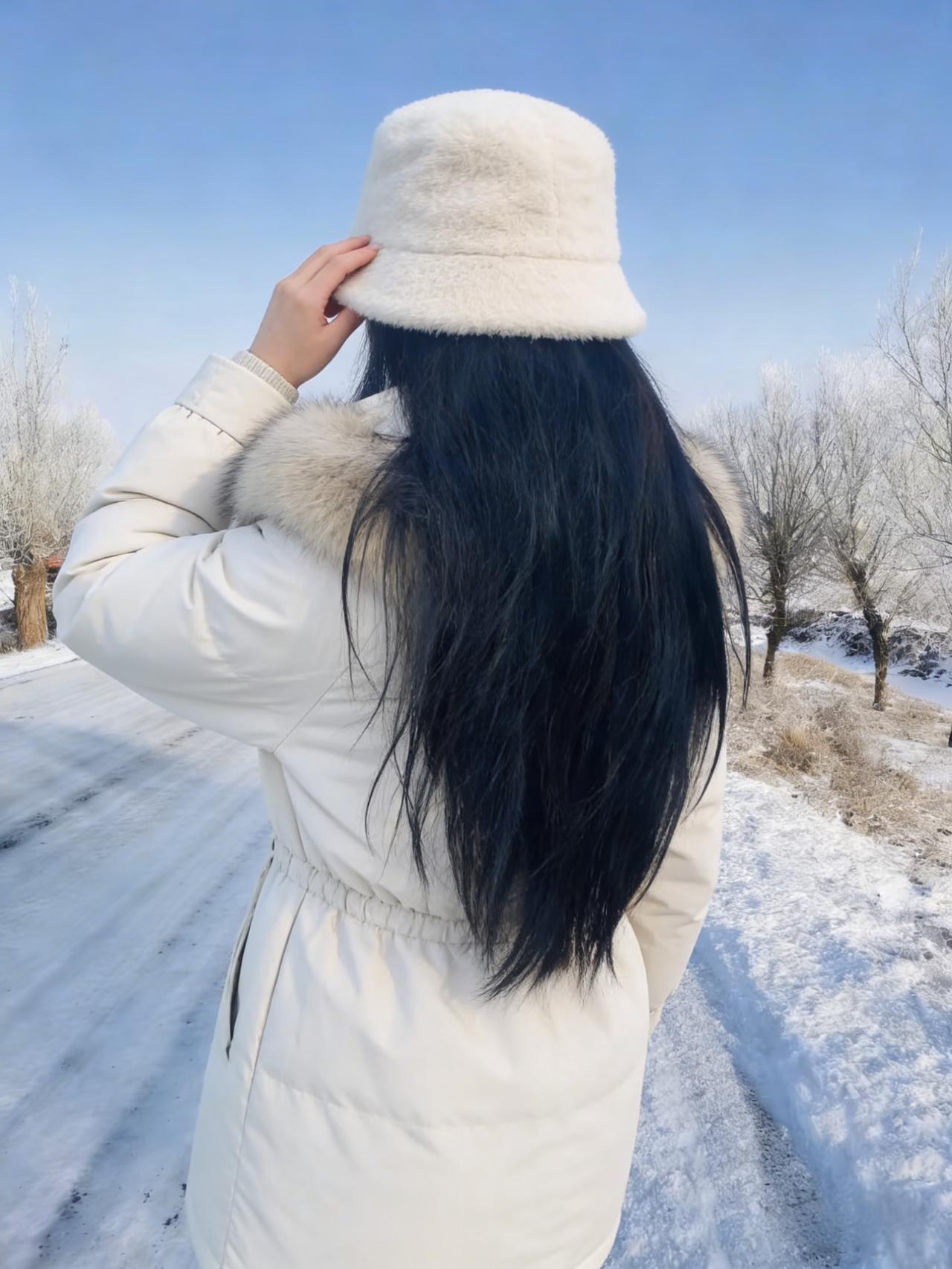 雪把世界揉成蓬松的棉团 你的背影是雪色里最柔软的笔触 黑长发垂落,像未融的夜 坠在白羽绒服的肩头,划开一片素白 ~ 风掠过雪地,卷起细碎的雪沫 你站着,不说话,成了冬的静物 牛仔裤裹着的腿,扎根在雪地里 像一棵年轻的树,枝桠是垂落的发 ~ 远处的树挂着雪,和你并肩站着 雪落在你的发梢,你没察觉 手指或许插在口袋里,或许交叠在身后 体温把寒冷隔在一层布料之外 ~ 这片雪野因你有了温度 背影是未说出口的诗,字里行间都是静 雪还在下,你的轮廓在雪雾里模糊又清晰 像雪融化前,最温柔的定格 ~ 你转身也好,不转身也罢 雪地里的这帧背影,已是冬的落款 是雪落在人间,最妥帖的模样 是风掠过荒原,最柔软的停靠