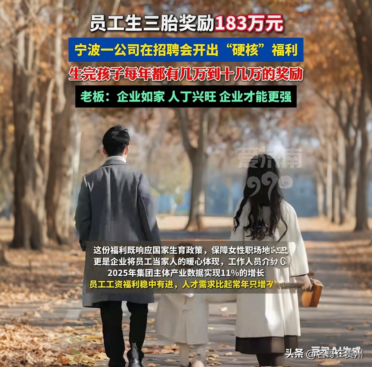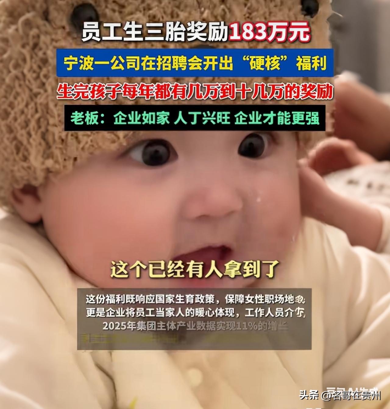 生三胎奖183万!宁波这公司发钱,网友:现在跳槽还来得及吗? 183万!不是彩票中奖,是员工生娃的奖励! 这两天宁波一家叫“盛威国际”的公司彻底火了,HR在招聘会上直接甩出一句话:生三胎,累计奖励183万!好多网友第一反应和我一样:这怕不是炒作吧?结果北仑区政府官号都出来证实了,这政策2022年就有了,而且已经有员工真金白银领到了钱! 来,我给大家掰扯掰扯这183万到底怎么拿。它不是一次性打款,而是从孩子0岁一直发到研究生毕业,妥妥的“包养式”福利。孩子上幼儿园前,每年给2万现金加2万购物卡;上中小学了,每年给3万现金加2万卡;到了高中每年8万;大学每年10万;最狠的是研究生阶段,每年直接发25万! 有人可能会撇嘴:分20多年发,平均下来也没多少嘛。但你想过没,这钱不是给你买包抽烟的,是精准卡在“教育内卷”和“补习班吞金”的节骨眼上发。那位2022年就领到钱的员工叶凌玲说了句话特实在:“这让我们在职场和家庭间感到了坚定和安心。” 当然,评论区也有清醒的网友一针见血:“这哪是福利,这明明是份长达20多年的‘对赌协议’。” 你仔细品,孩子从0岁到研究生毕业,起码22年。这22年里,为了每年准时拿到这笔钱,你会轻易跳槽吗?不会。你会盼着公司蒸蒸日上别倒闭吗?会!甚至你教育孩子都得加把劲,毕竟考不上大学,后面的研究生那25万的大头可就飞了。 所以你看,老板其实也在下一盘大棋。183万听起来是天价,但买断的是一个高级人才家庭未来20多年的绝对忠诚和稳定性。 说到底,这世界上最牛的投资,不是画大饼谈理想,而是像这样,把你的余生和后代的焦虑,都跟你死死绑在一起。 咱们也别光羡慕,聊点实际的:假设你公司也出这个钱,但条件是你得在那儿干满20年,你愿意为了这183万,拼个三胎吗? 宁波公司三胎奖励183万 打工人嘴替 那些别人家的公司