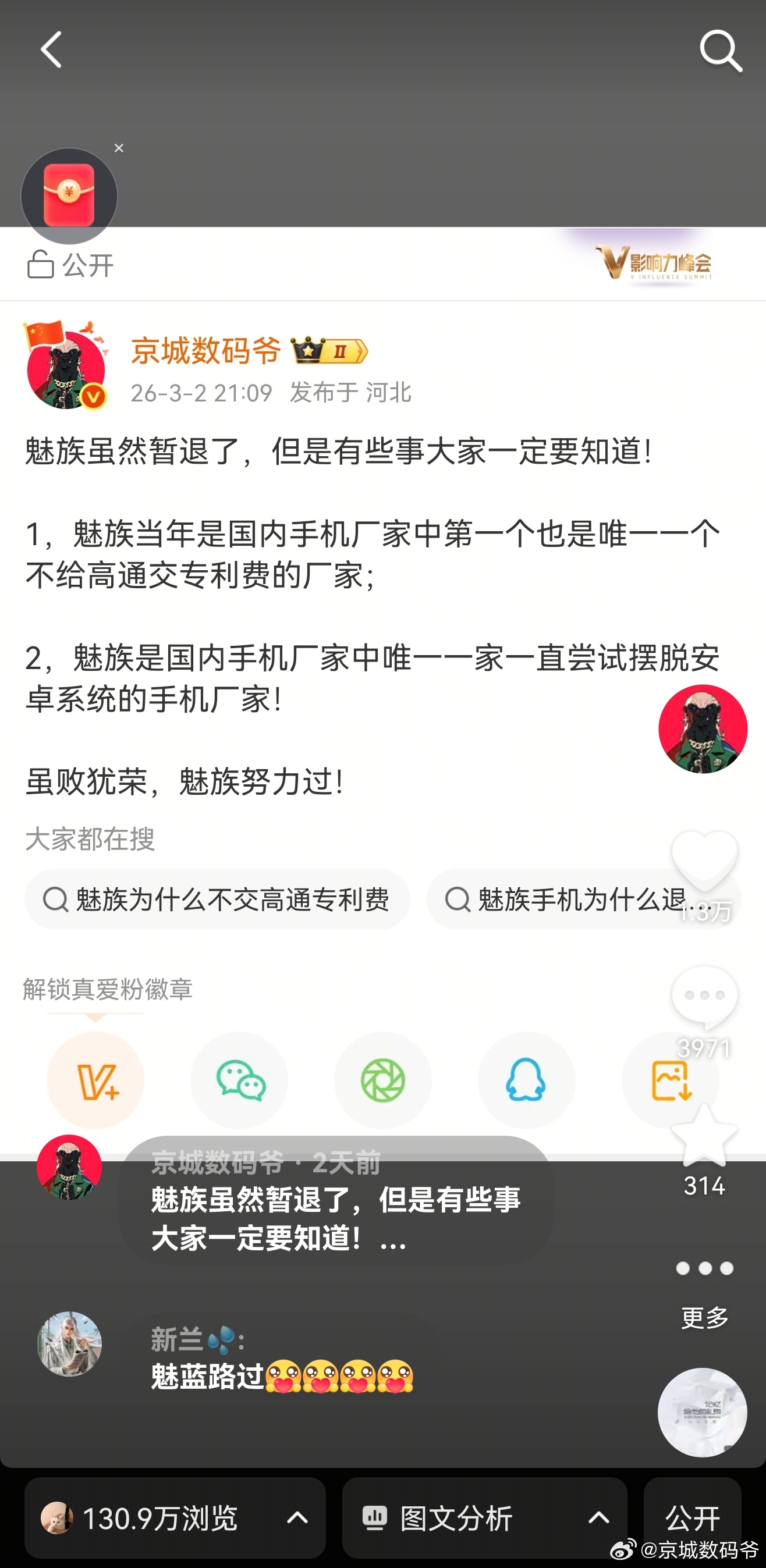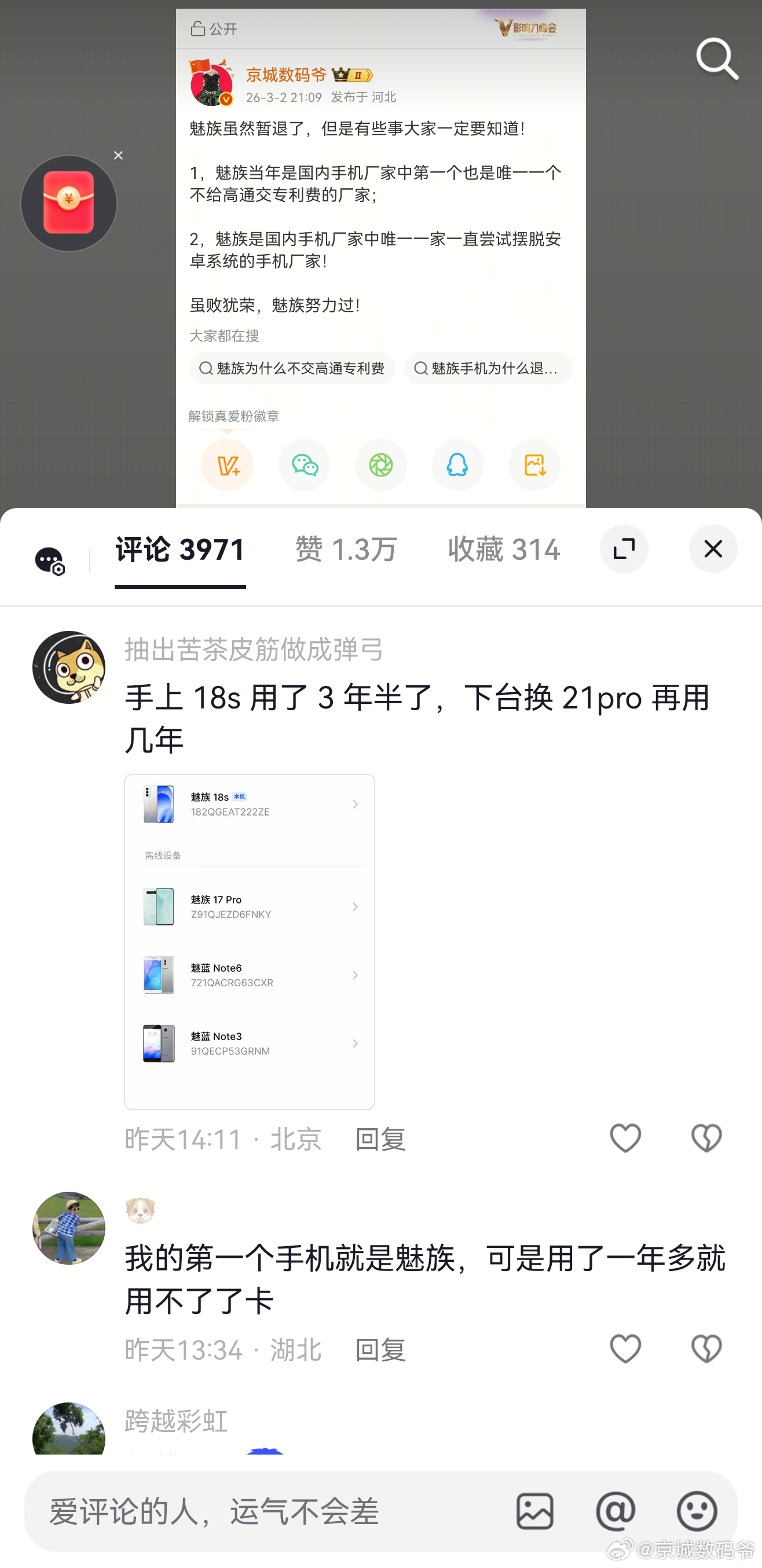前天dy发了那条替魅族感到惋惜的,播放量已经过了130万,很多人都感觉很可惜!