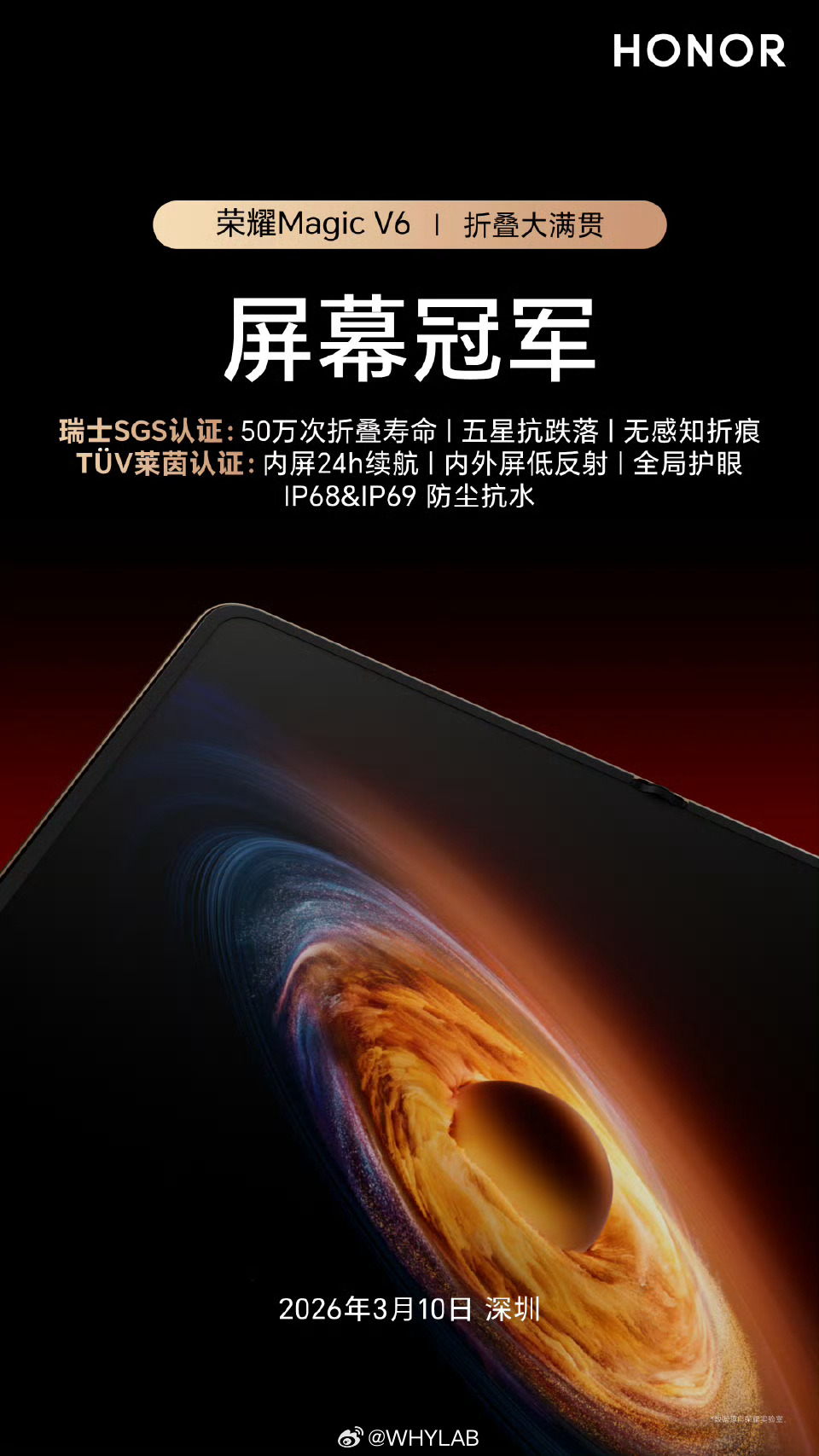 荣耀 Magic V6 搭载无痕感知 UTG 屏,1.5% 反射率,通过瑞士 SGS、TÜV 莱茵、IP68 & IP69 认证测试。