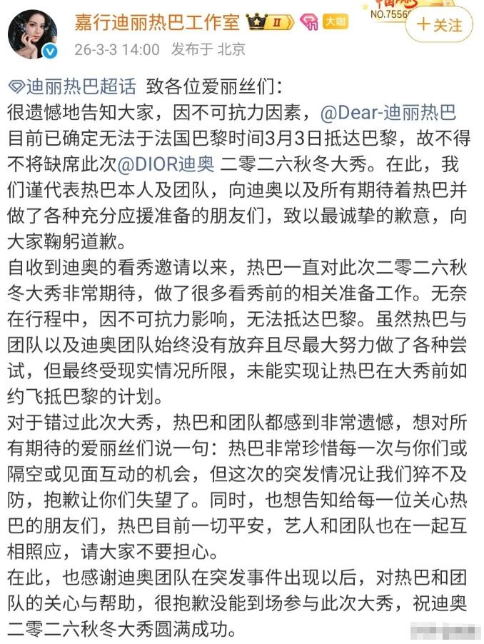 迪丽热巴团队出现重大失误!! 本来热巴3号要去巴黎秋冬大秀,工作室安排她经迪拜转机,团队工作人员全部直飞巴黎,居然只留她一人中转阿联酋飞巴黎…… 迪拜机场关闭,热巴还滞留迪拜? 2026年3月,对于迪丽热巴来说,本该是奔赴一场重要国际亮相的日子。 作为迪奥全球品牌大使,她早就确定要去参加3号的巴黎秋冬大秀,品牌方那边早早发了正式邀请,粉丝们也盼了很久,就等着看她在秀场上的表现,连应援的东西都准备好了。 可谁能想到,一场离谱的行程安排,把她困在了战火纷飞的迪拜。 这次去巴黎的行程,全是她所属的嘉行传媒一手安排的。 说出来可能没人信,本来热巴3号要去巴黎秋冬大秀,工作室安排她经迪拜转机,团队工作人员全部直飞巴黎,居然只留她一人中转阿联酋飞巴黎。 整个团队十几号人,不管是经纪人还是化妆师,全买了直飞巴黎的机票,就唯独把她这个核心艺人,安排了需要在迪拜中转的航线,而且当时中东那边的局势,已经不算安稳了。 其实在她出发前几天,中国驻阿联酋大使馆就已经发了安全提醒,告诉在当地的中国人要多注意安全,谨慎安排出行。 可嘉行传媒的团队,好像根本没把这个提醒当回事。 就在她出发前一两天,也就是2月28号,美国和以色列对伊朗发动了军事打击,伊朗也马上进行了报复,往中东好几个国家发射了导弹和无人机。 阿联酋虽然没直接参与冲突,一直保持中立,但架不住地理位置特殊,又和美国、以色列走得近,很快就被卷进了这场风波里。 迪拜国际机场的T3航站楼,被导弹的碎片击中了,现场乱得不行,旅客们都拖着箱子慌慌张张地疏散,天花板的碎片掉了一地,还有4个机场工作人员受了伤。 紧接着,阿联酋就关闭了全部领空,中东三大民航公司也都停航了,两天时间里,全世界有三千多架次航班被取消。 迪丽热巴坐的飞机,刚好在这个时候飞到了迪拜,机场一关闭,她就彻底被困住了。 最让人担心的是,刚开始滞留的那几个小时,她和外界完全联系不上,一个人待在候机厅里,身边连个团队的人都没有,那种身处战火边缘的无助,想想都让人揪心。 就在她一个人在迪拜担惊受怕的时候,她的那些团队成员,已经顺顺利利到了巴黎。 更让人不舒服的是,这些人到了巴黎之后,还在社交平台上发动态,拍下午茶的照片,发自己的自拍,看起来过得十分悠闲,和迪丽热巴在迪拜的困境比起来,反差特别大。 这些动态被网友看到后,很快就引起了大家的讨论。 粉丝们知道迪丽热巴被困的消息后,急得不行,在社交平台上到处问她的情况,留言刷得密密麻麻,就想知道她是不是安全。 可迪丽热巴的工作室,在事情闹大后的整整一天里,一句话都没说,既不通报她的安全状况,也不解释到底发生了什么,这让粉丝们的焦虑越来越重。 一直到3月3号下午,工作室才终于发了公告,说因为不可抗力,迪丽热巴没办法按时到巴黎,只能缺席这次的迪奥大秀。 公告里还说“艺人和团队在一起互相照应”,可这话一出来就被网友拆穿了——团队的人明明都在巴黎,根本不在迪拜,这份声明不仅没起到安抚作用,反而让更多人开始质疑工作室。 随着这件事越闹越大,网友们也扒出了嘉行传媒之前的一些问题。 有粉丝说,这已经不是第一次了,以前很多时候,明明有直飞的航班,公司偏要给迪丽热巴安排中转,大家都怀疑公司是为了省钱,根本不管她的舒服不舒服、安全不安全。 这次大使馆都发了安全提醒,公司还非要让她去迪拜中转,这明显就是工作失职。 还好没过多久,迪丽热巴自己通过社交平台和粉丝报了平安,她在候机厅里拍了动态,安抚大家的情绪,看得出来她很贴心,也很从容。 可嘉行传媒那边,除了发了那篇漏洞很多的声明,就再也没有任何回应,也没对这次的行程失误做任何解释,公司里的其他工作人员,也跟没事人一样,该玩该喝,一点都没受影响。 这次的意外,让迪丽热巴错过了巴黎大秀这个重要的国际亮相机会,本来该是她的高光时刻,最后却变成了一场风波。 这也让她不得不静下心来,重新想想自己以后的职业规划。 现在,迪拜机场已经慢慢恢复运营了,滞留的旅客也在慢慢疏散,大家最关心的,还是迪丽热巴能早点顺利离开迪拜,平平安安地回到国内。 说实话,迪丽热巴作为顶流,不管是品牌方还是粉丝,都对她抱有很大的期待,而经纪公司本来应该是保护她的人,可这次的安排,却把她推向了危险的地方。 团队的人都直飞避险,就留她一个人中转,这样的操作,实在让人想不通,也难免让人怀疑,公司到底有没有真正重视艺人的安全。