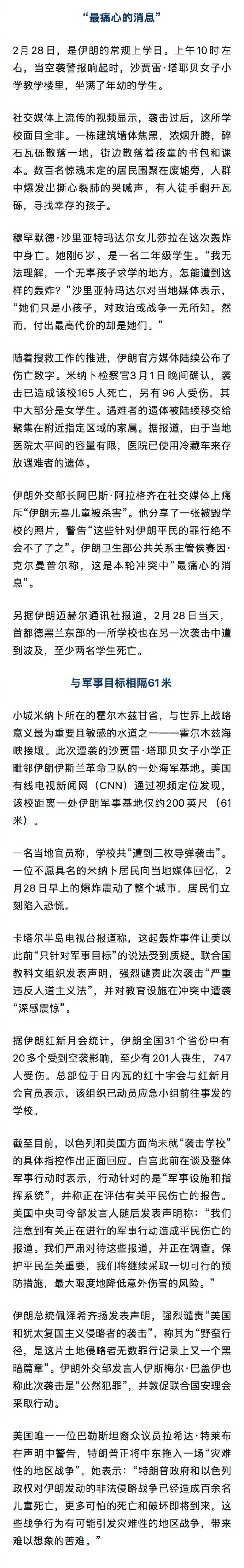 随着搜救工作的推进,伊朗官方媒体陆续公布了伤亡数字。米纳卜检察官3月1日晚间确认,袭击已造成该校165人死亡,另有96人受伤,其中大部分是女学生。遇难者的遗体被陆续移交给聚集在附近指定区域的家属。据报道,由于当地医院太平间的容量有限,医院已使用冷藏车来存放遇难者的遗体。#伊朗导弹击中美第五舰队总部瞬间##中东冲突让日韩一起慌了##法国派出航母##伊朗宣称重创美军##伊朗遇难学生一个个墓穴让人心碎#(中国新闻周刊)
