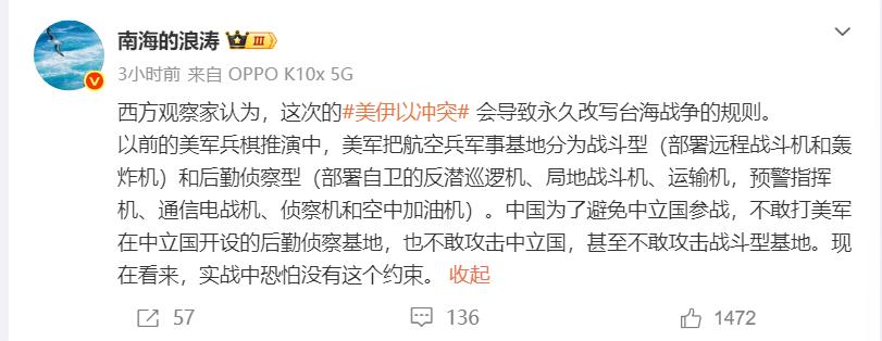 西方观察家认为,这次的“美伊以冲突”会导致永久改写台海战争的规则? 就在刚刚,某大V爆料:以往美军台海兵棋推演,将航空兵基地分为战斗型(远程战机、轰炸机)与后勤侦察型(预警机等保障装备)————并预设中国为避免中立国参战,既不敢打中立国境内的美军后勤侦察基地,也不敢碰其战斗型基地。 然而,从当前中东实战来看,这一约束根本不成立 就在 2026 年 2 月 28 日,伊朗为反击美以联合空袭本土,果断启动 “真实承诺 4” 大规模军事行动,直接把矛头对准中东地区 27 个美军基地,没有丝毫犹豫,没有任何区分。 不管是巴林的美军第五舰队总部,还是卡塔尔的乌代德空军基地,不管是科威特的后勤补给枢纽,还是阿联酋的 F-35 战机部署点,只要是美军的作战支点,就全是打击目标。 卡塔尔乌代德基地是美军在中东规模最大的空军基地,也是美国中央司令部前沿总部,基地内那台造价高达 11 亿美元的 AN/FPS-132 “铺路爪” 远程预警雷达,探测距离足有 5000 公里,是美军监控中东导弹动向的 “千里眼”,属于最典型的后勤侦察核心装备,结果在第一波打击中就被彻底摧毁,直接变成一堆废铁,美军的战场预警能力瞬间出现致命缺口。 巴林的第五舰队总部油库,储存着几十万吨舰用燃油,是美军舰队的后勤命脉,伊朗导弹精准命中,大火连续燃烧十几个小时,没了燃油补给,美军航母直接沦为漂在海上的 “铁疙瘩”,连舰载机都无法起飞。 科威特阿里夫詹基地是美军核心陆军后勤枢纽,承担装备中转、油料储备、前线调度的关键任务,连续遭遇十几轮无人机与导弹联合打击,作战指挥室和补给仓库全被炸毁,弹药与燃油引发连环爆炸,救援人员根本无法靠近。 即便是阿联酋宰夫拉这种部署 F-35 隐形战机的纯战斗型基地,同样遭到饱和打击,机场跑道损毁,多架战机还未升空就被摧毁在地面。 这些都是有据可查的真实战果,不是纸上谈兵的推演,伊朗用最直接的行动证明,现代战争中,没有任何一个为敌方服务的军事目标是安全的。 无论打着战斗还是后勤的旗号,无论躲在哪个国家境内,只要参与战争、威胁对手,就必然会被精准打击,所谓的中立国庇护、所谓的基地类型划分,在实战面前一文不值。 把中东的实战逻辑照搬到台海,美军以往的推演前提就彻底站不住脚了。美军一直指望日本、韩国等国的基地充当干涉台海的前沿阵地,把嘉手纳、横须贺、普天间这些基地当成高枕无忧的后方,笃定我们不敢动手,担心引发多国参战。 可中东的例子明明白白告诉所有人,只要这些基地为美军提供战机起降、后勤补给、预警侦察支持,哪怕所在国嘴上喊着中立,实际上已经成为战争的参与方,我们完全有权利、有能力实施反制打击。 我们的东风系列导弹,射程完整覆盖第一岛链、第二岛链的所有美军基地,不管是停放轰炸机的战斗基地,还是部署预警机的后勤基地,全都在我们的精准打击范围之内。 我们的导弹精度与突防能力,经过无数次试验验证,完全可以做到指哪打哪,就像伊朗摧毁美军预警雷达一样,我们能在第一时间打掉美军在台海周边的所有侦察、指挥、后勤节点,让美军战机变成瞎子、聋子,让他们的舰队失去补给支撑,根本无法形成有效战斗力。 美军之前的台海推演,错就错在把残酷的战争当成了理想化的游戏,用自己的主观臆断限定对手的行动。 他们彻底忘了战争的本质是你死我活的较量,忘了现代战争早已没有前后方之分,忘了后勤与侦察装备就是作战体系的 “七寸”,打蛇就要打七寸,这是最朴素也最实用的战争道理。 中东战场上,伊朗没有航母,没有批量隐形战机,仅凭弹道导弹与无人机组合,就能把美军 27 个基地打得全面瘫痪,让美军前沿部署能力直接下降 40%,短期内根本无法恢复。 而我们的军事实力远非伊朗可比,我们的远程打击能力、区域拒止能力,是全球公认的一流水平,真到台海有事之时,我们怎么可能像美军设想的那样束手束脚,怎么可能放过那些直接威胁我们核心利益的军事目标? 也正是因为看清了这一点,西方观察家才会明确提出,美伊以冲突带来的实战启示,直接颠覆了台海战争的原有规则。 以往美军靠预设虚假前提赢下的推演,现在全部失效,未来台海战争的新规则只有一条:任何外部势力胆敢干涉台海,其所有军事支点都会被彻底摧毁,不管是战斗基地还是后勤基地,不管位于哪个国家,都逃不过毁灭性打击。 这不是口头威胁,是中东实战验证过的铁律,是用导弹与炮火写就的事实。 美伊以冲突已经把道理讲得明明白白,台海战争的规则已经永久改写,从现在起,规则由我们说了算,由实战说了算,任何干涉势力都别想躲在所谓中立国的背后搞小动作。 他们的每一个军事目标,都牢牢在我们的瞄准镜里,这就是不容挑战的现实,这就是我们捍卫国家统一的底气。