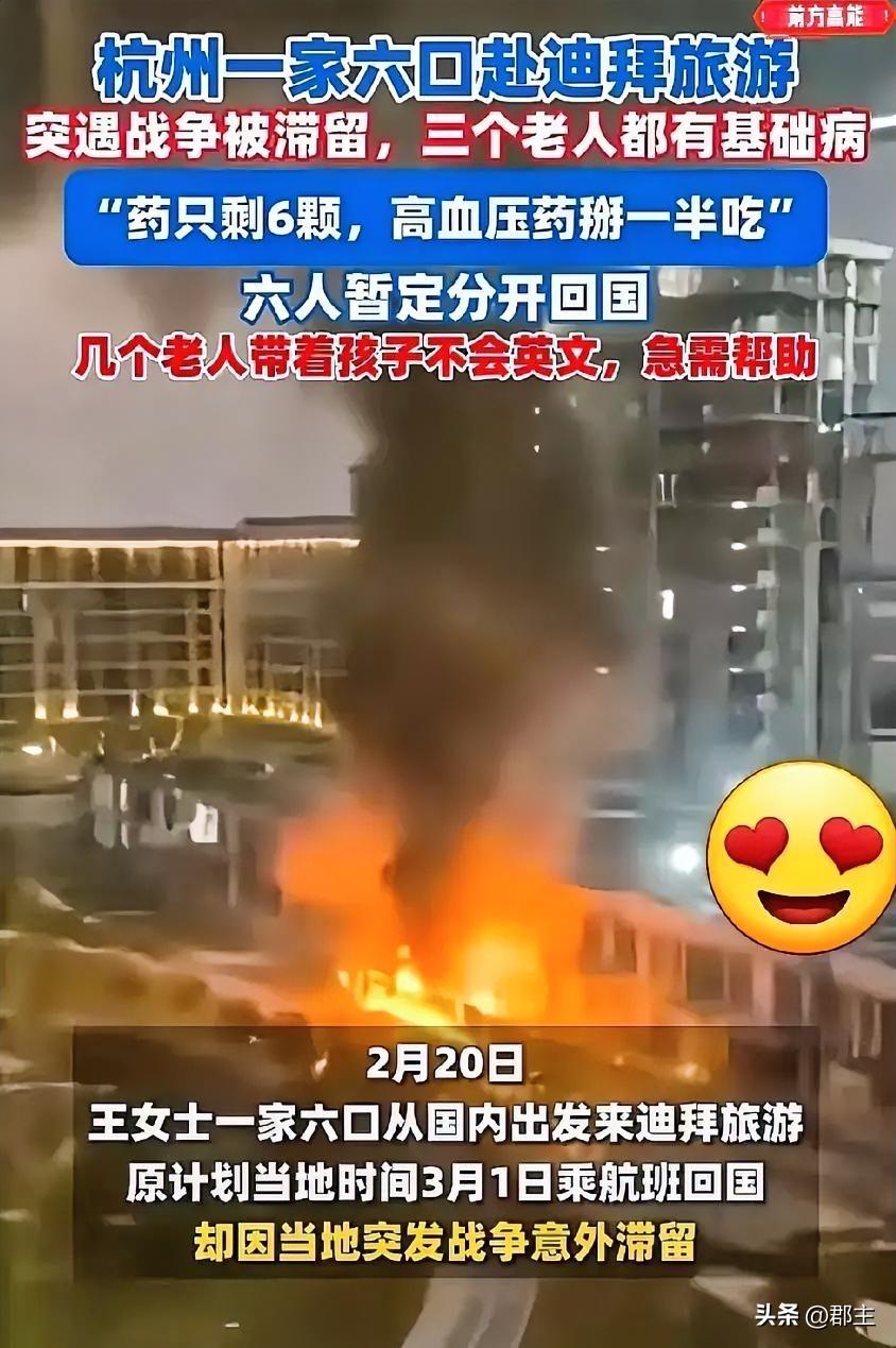 这不就是要穷人帮助富人吗?富人一家六口春节赴迪拜旅游,因为美国、以色列打击伊朗的原因,导致这一家六口回国困难重重,有三个老人因为有病,带的药物已经不够,他们向外界求助,希望尽快回到国家。 网友评论:这帮富人们出去溜达一圈,回来还要求我们帮助,带那么多钱出去玩,迪拜这个地方消费可不低,还是一家六口,可见他们是非常有钱的。我们大多数是普通的工薪阶层,为了孩子的学费,为了一家人的温饱,每天都忙得焦头烂额。而他们却拿着高额的退休金,带薪年假到处飞。我们很多人连飞机都没有坐过,更别说出国了。有困难的时候没有人关心,他们一点不如意就要寻求帮助,不是我们冷漠,实在是我们的爱心被一些人消耗殆尽了。只能说,愿平安吧!