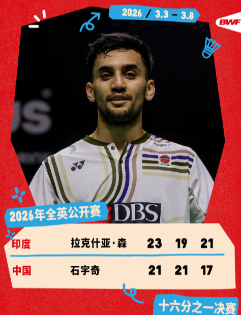 石宇奇鏖战三局不敌拉克什亚·森,止步男单首轮。