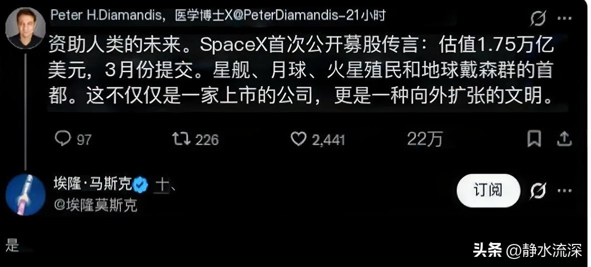 继AI以后又一场“淘金热”,有传闻本月提交上市申请,估值1.75万亿美元,马斯克在社交媒体的回复算是默认了。 参考星链和发射业务,加上平台溢价,长期看能到这个价,预计2040年营收可达1500亿美元,比现在增长近10倍。 但风险也很直接,监管瓶颈、技术延误,加上马斯克自带的高波动,上市后单日波动20%-30%都是可能的。 要投SpaceX,得做好三到五年的准备,还得能容忍比特斯拉更猛的颠簸。