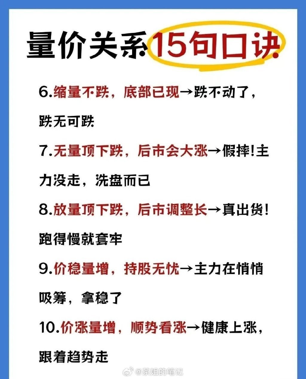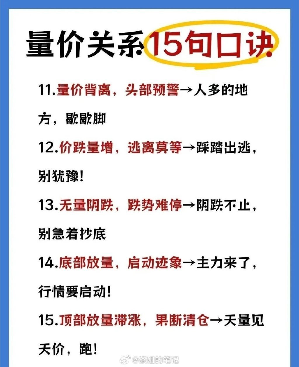 1. 放量上涨,必然回调→人多歇脚(短期可能调整)。2. 放量下跌,必然反弹→恐慌抛售后必有反抽(短期超跌反弹)。3. 缩量上涨,继续上涨→大家都惜售,还能涨(强势信号)。4. 缩量下跌,还要下跌→没人接盘,还得阴跌(弱势信号)。5. 放量不涨,头部已现→雷声大雨点小,危险信号(见顶风险)。6. 缩量不跌,底部已现→跌不动了,跌无可跌(筑底信号)。7. 无量顶下跌,后市会大涨→假摔!主力没走,洗盘而已(洗盘信号)。8. 放量顶下跌,后市调整长→真出货!跑得慢就套牢(出货信号)。9. 价稳量增,持股无忧→主力在悄悄吸筹,拿稳了(吸筹信号)。10. 价涨量增,顺势看涨→健康上涨,跟着趋势走(上涨趋势确认)。11. 量价背离,头部预警→人多的地方歇歇脚(见顶前兆)。12. 价跌量增,逃离莫等→踩踏出逃,别犹豫!(风险极大,赶紧跑)。13. 无量阴跌,跌势难停→阴跌不止,别急着抄底(风险大,不抄底)。14. 底部放量,启动迹象→主力来了,行情要启动!(建仓/启动信号)。15. 顶部放量滞涨,果断清仓→天量见天价,跑!(高位出货信号)。
