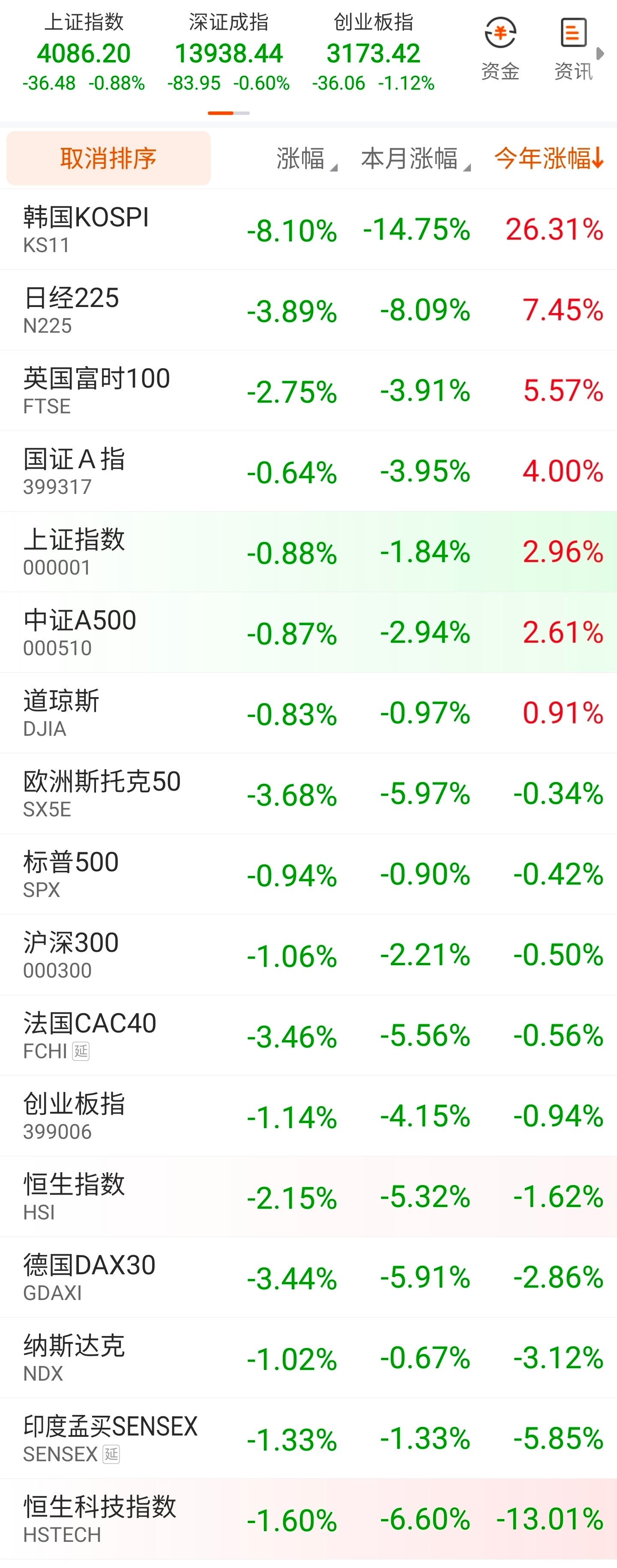 欧洲50、标普500、沪深300、创业板指、恒生指数、法、德、纳指等指数2026年翻绿进入亏损区间;