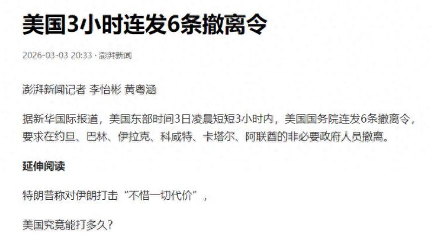后背发凉,今天看到美国国务院连发6条撤离令的消息,特朗普急着谈判的背后,其实是子弹卡壳的窘迫。 一位常驻中东的媒体老友深夜发来语音,声音压得极低:“命令是连夜下的,卡塔尔、阿联酋、伊拉克、科威特、约旦、巴林——全是美军基地扎堆的地方。但蹊跷的是,只撤‘非必要’文职,战斗部队一动没动。这哪是防伊朗,分明是怕自己人先乱。”更绝的是,沙特使馆被炸时连无人机都拦不住,同一套防空系统却在科威特上空“误击”三架美军F15,一发没漏。中东各国嘴上谴责,行动却集体沉默,仿佛等着看戏。特朗普前一天还吼着“不惜一切代价”,转头就放软话想谈判,可德黑兰直接甩回一句“从未联系”,把他晾在了杠头上。 现在一想到大国博弈时那些“盟友”的冷眼,我就觉得所谓安全网薄得像层纸。你们身边,有这种表面鼓掌、背后拆台的潜规则吗?