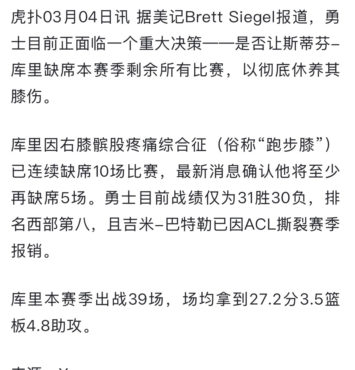 库里肯定不会缺席本赛季他的性格 如果勇士最近战绩很差 掉到附加赛9-10我猜库里这个月肯定就会复出 如果勇士战绩还是老8 库里倒是可以安心养病健健康康后月底或4月初复出 冲附加赛主场优势