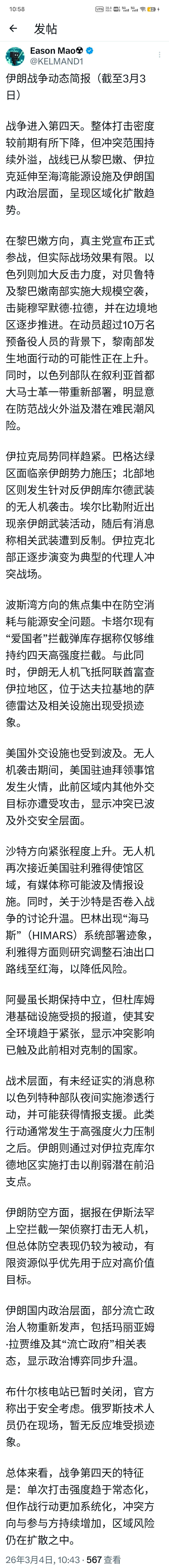 总体来看,战争第四天的特征是:单次打击强度趋于常态化,但作战行动更加系统化,冲突方向与参与方持续增加,区域风险仍在扩散之中。来源:x美伊以冲突中东现场直击