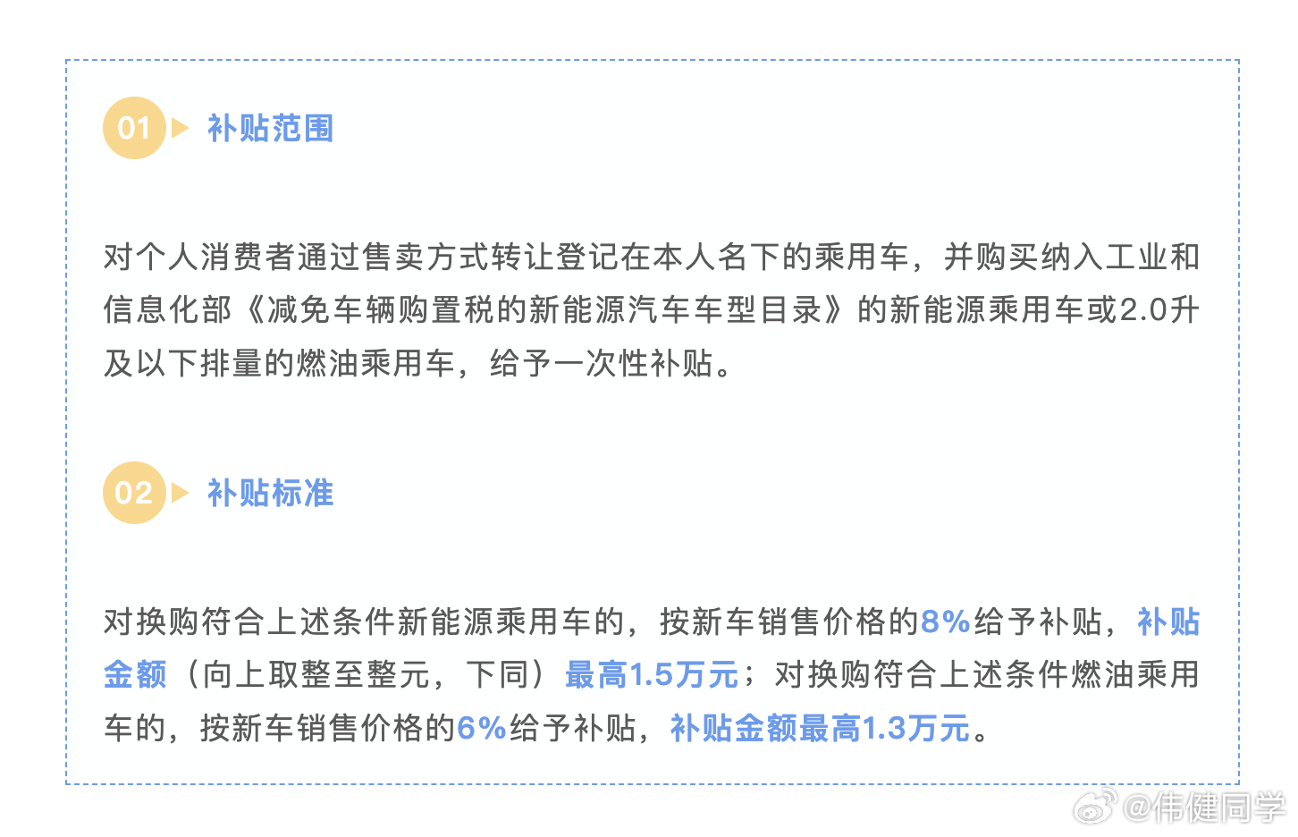 - 新能源乘用车:按新车销售价格的8%给予补贴,最高1.5万元。- 燃油乘用车(2.0升及以下排量):按新车销售价格的6%给予补贴,最高1.3万元。- 旧车须登记在本人名下,且于2025年1月8日前注册登记,并在政策期间内完成转让。- 时间:2026年1月1日至12月31日(补贴资金使用完毕或政策期满即止)