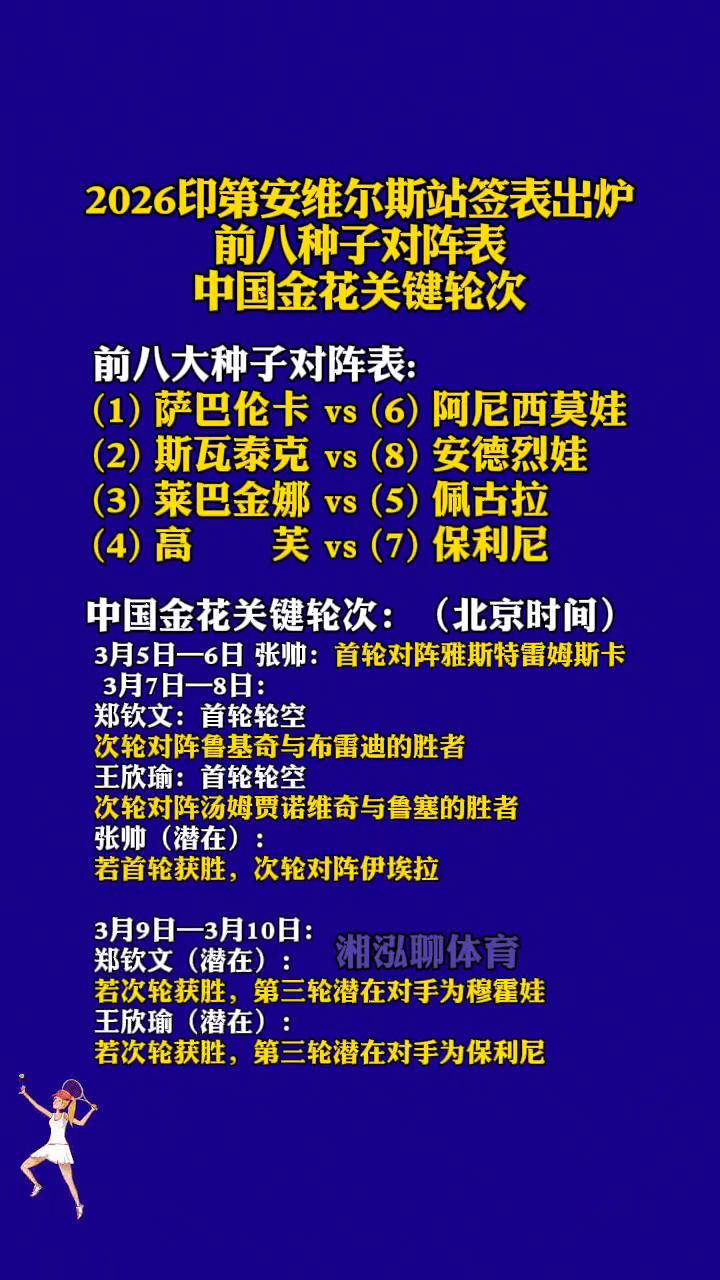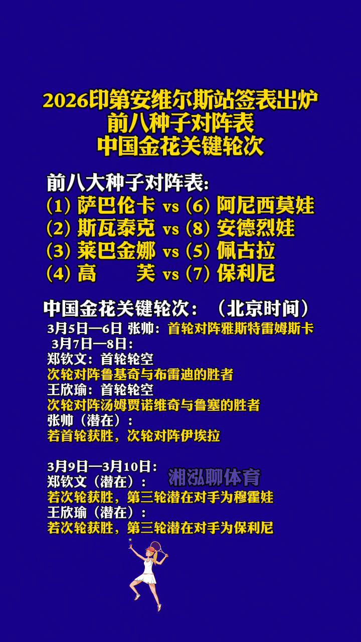 2026印第安维尔斯站签表出炉,前八种子对阵表。 湘泓聊体育。 中国金花关键轮次: ·前八大种子对阵表: →(1)萨巴伦卡vs(6)阿尼西莫娃。 →(2)斯瓦泰克vs(8)安德烈娃。 →(3)莱巴金娜vs(5)佩古拉。 →(4)高芙vs(7)保利尼。 ·中国金花关键轮次: →(北京时间)3月5日-6日张帅:首轮对阵雅斯特雷姆斯卡。 →3月7日-8日郑钦文:首轮轮空,次轮对阵鲁基奇与布雷迪的胜者。 →王欣瑜:首轮轮空,次轮对阵汤姆贾诺维奇与鲁塞的胜者。 →张帅(潜在):若首轮获胜,次轮对阵伊埃拉。 →3月9日一3月10日郑钦文(潜在):若次轮获胜,第三轮潜在对手为穆霍娃。 →3月9日一3月10日王欣瑜(潜在):若次轮获胜,第三轮潜在对手为保利尼。