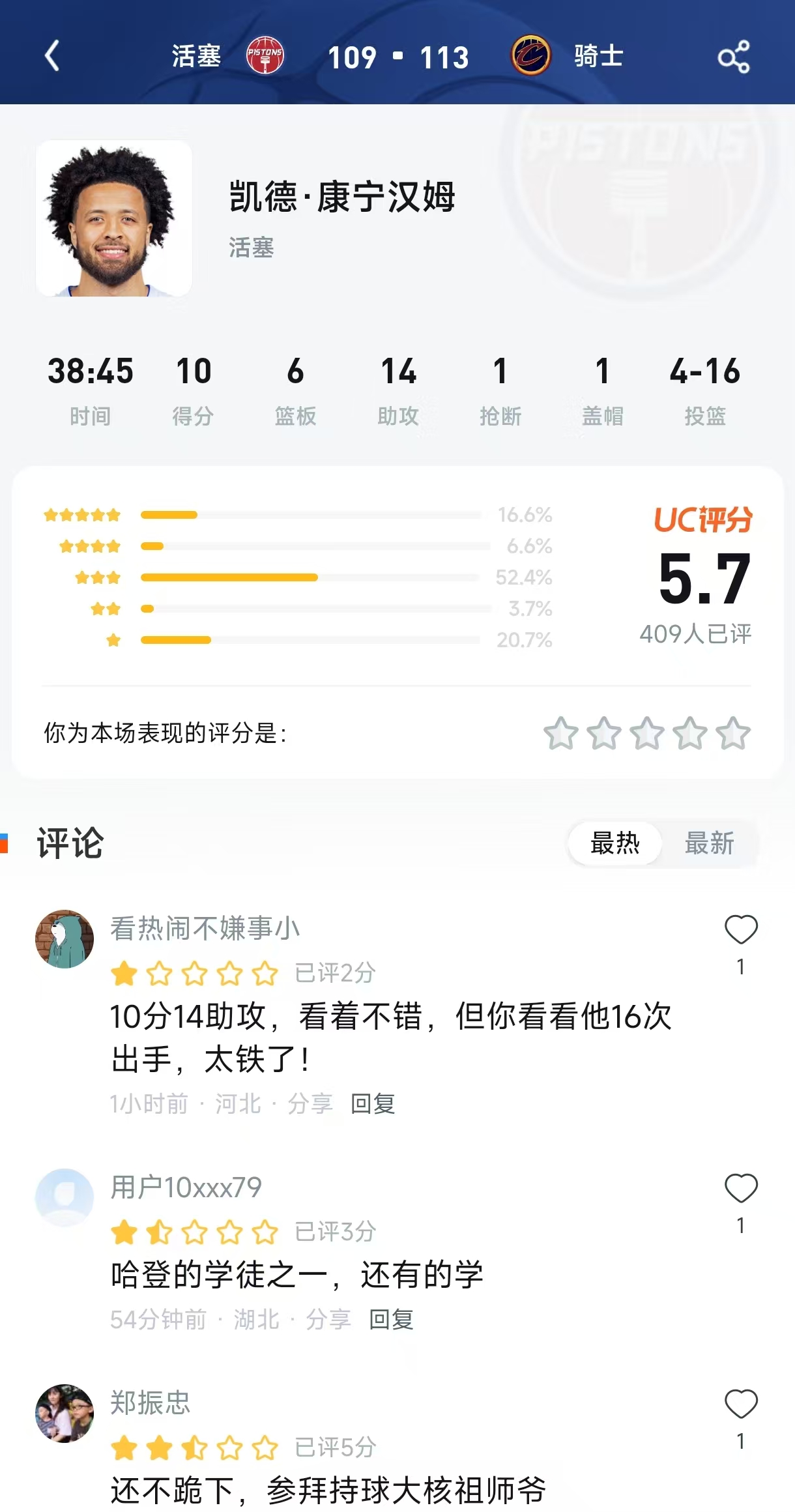 原始UC评分截图(文字还原) 球员: 凯德·康宁汉姆(活塞) 评分: 5.7分(409人已评)