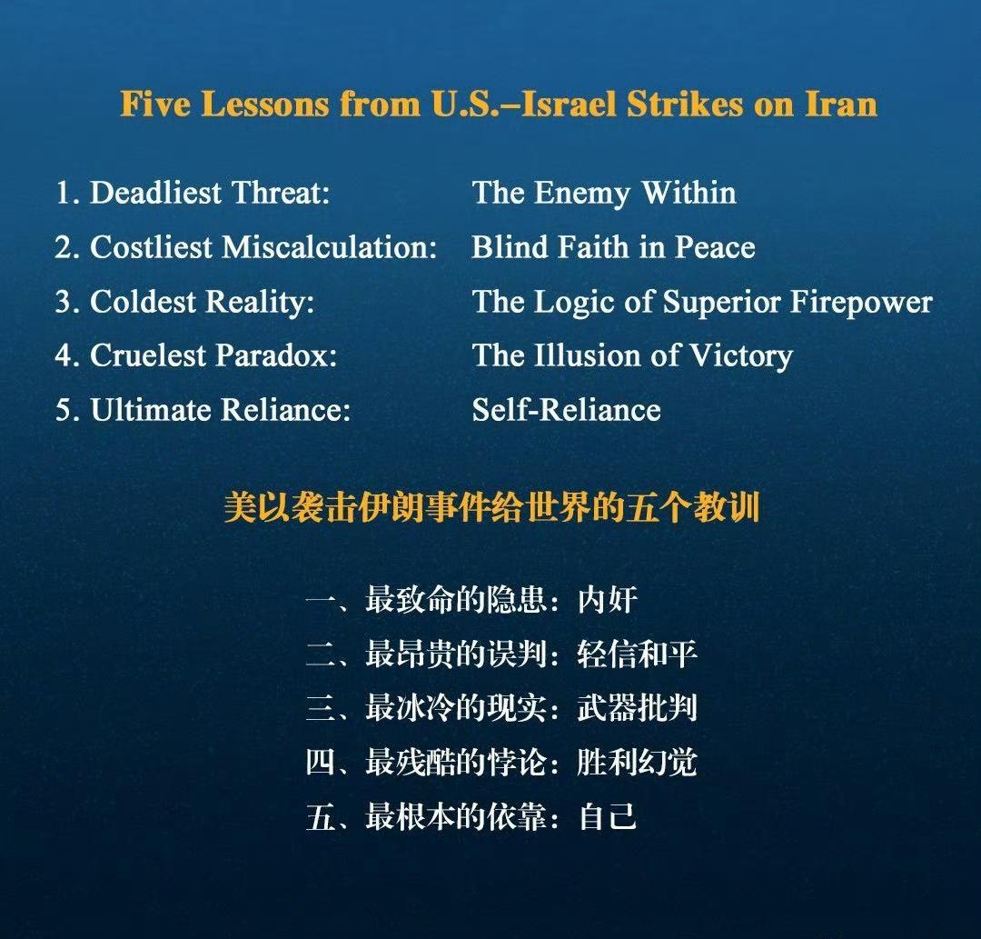 中国军报海外版指出:美以袭击伊朗事件给世界带来五个教训,这总结真是太到位了。 美以的这种袭击行为,完全是霸权主义的体现。从这件事能看出,国际秩序不能任由强国肆意践踏。比如,一些小国在这种霸权面前只能忍气吞声,尊严主权被任意践踏。这也提醒各国,自身军事力量的建设至关重要,只有拳头硬了,在国际上才有话语权。 同时,国际社会应该团结起来,共同抵制这种单边主义的军事行动,不然世界就会陷入混乱。 美以的做法就是对和平的挑衅,各国都应从这一事件中吸取教训,维护世界和平。