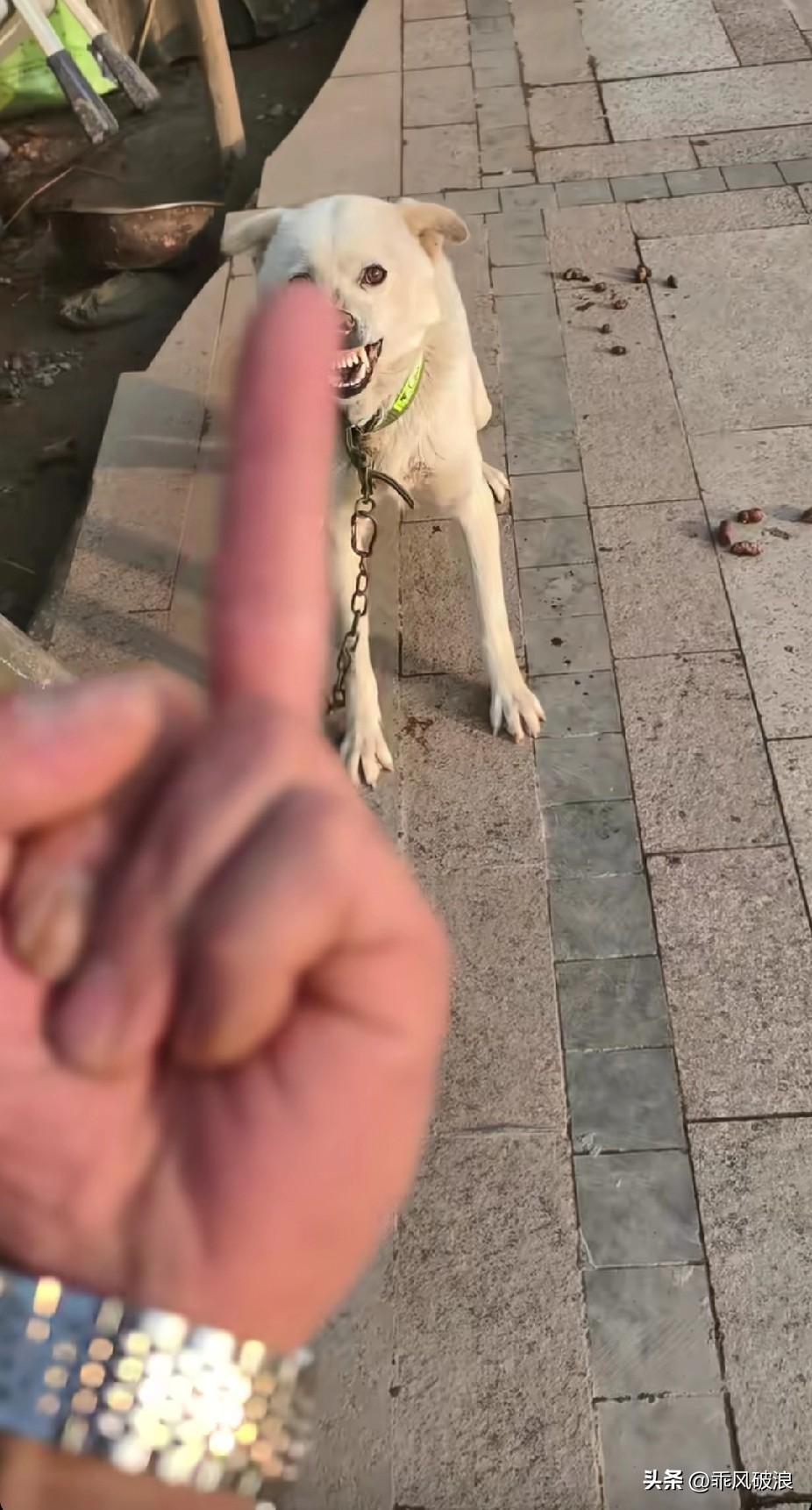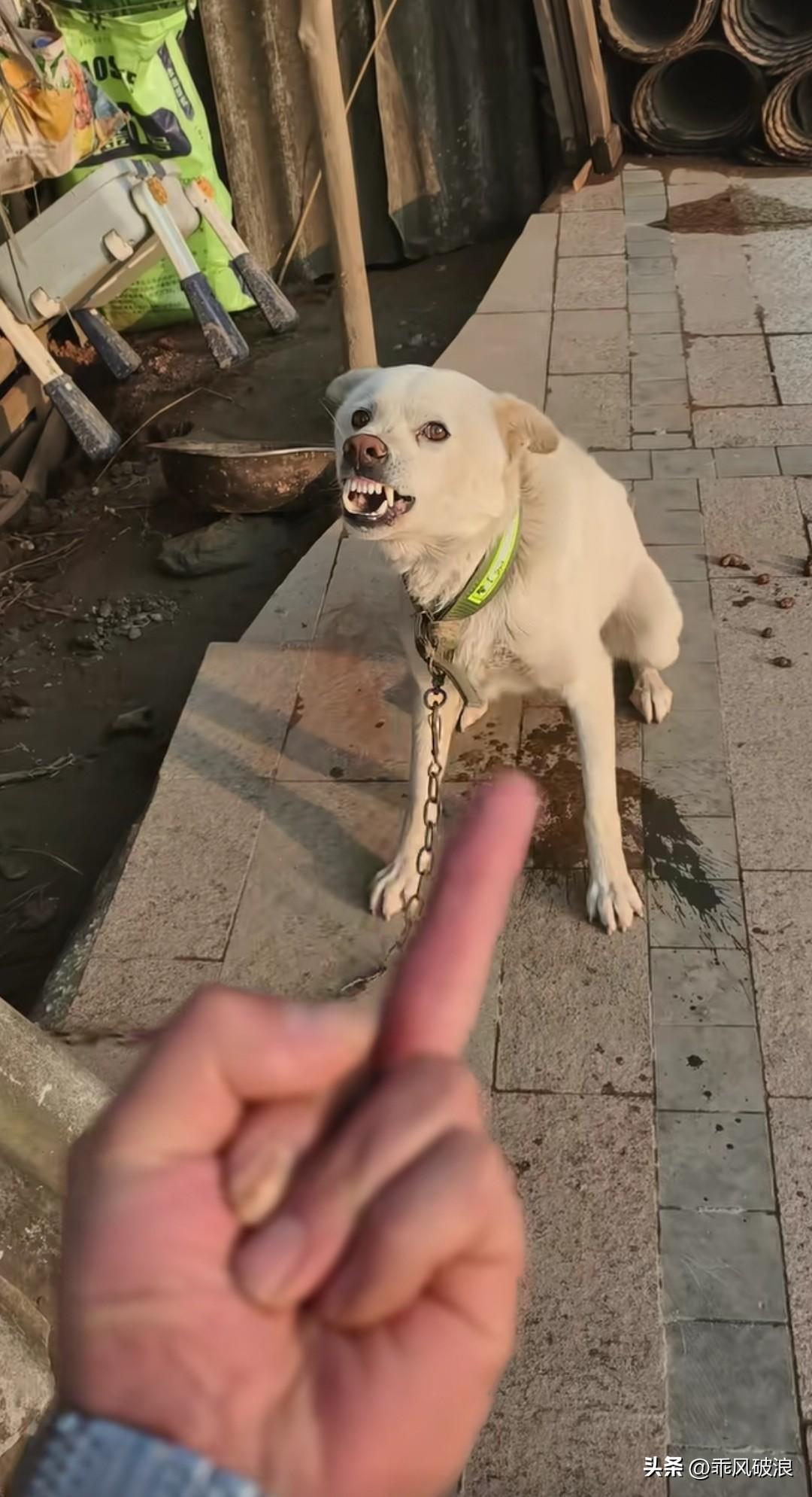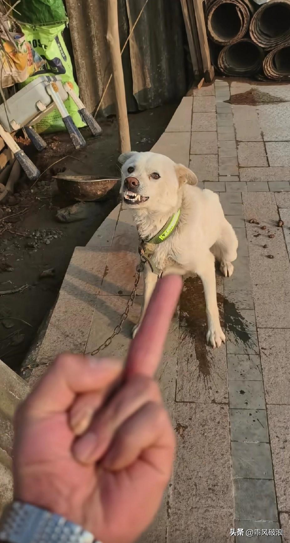 狗狗对着主人撕牙烈嘴,狂叫不止,主人伸出一个中手指,并不停地钩来钩去说道,你有本事就过来咬呀,狗狗看到这钩来钩去的手指,吓得一边狂叫一边塮尿。怒斥狗狗