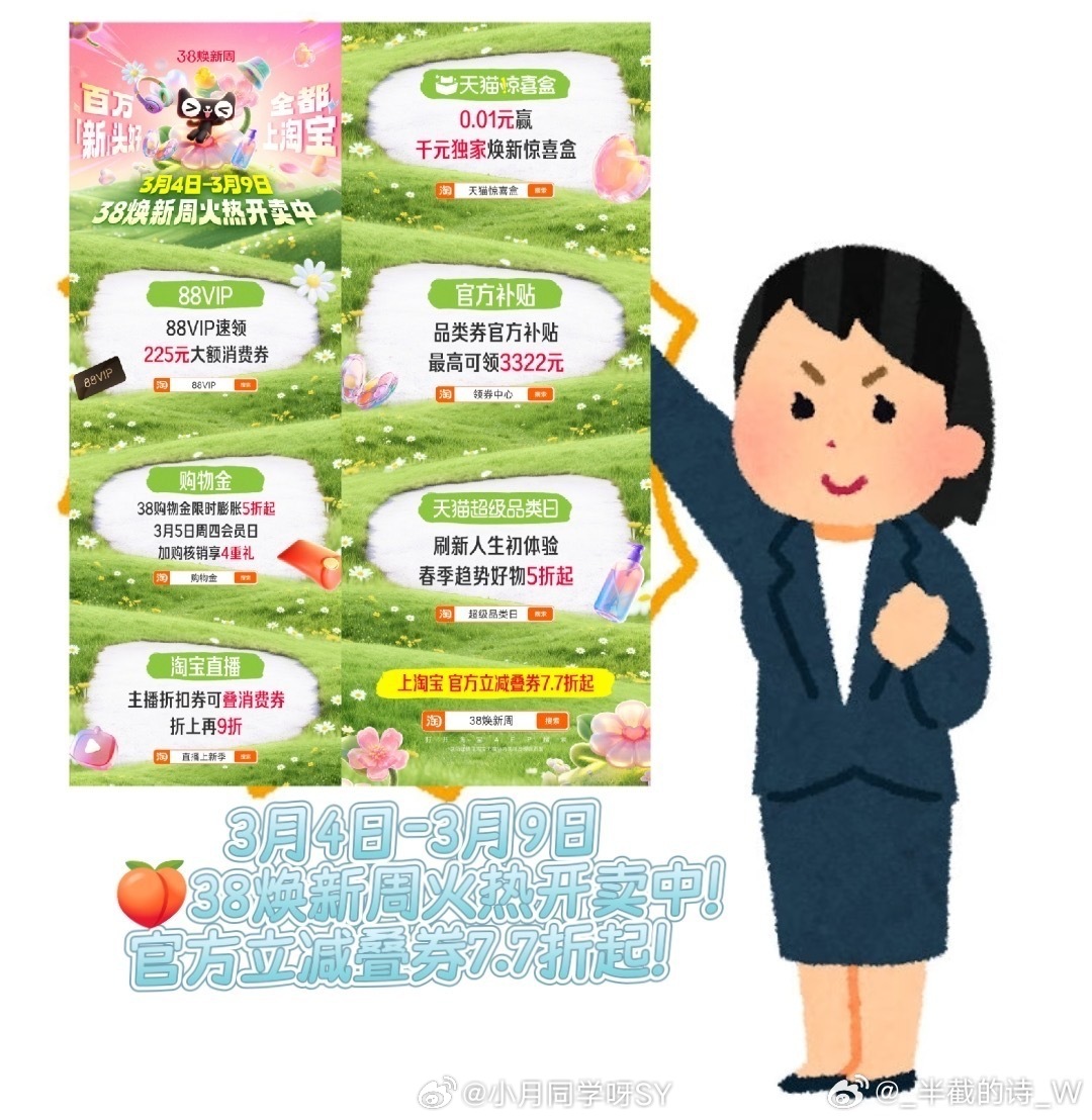 上淘宝38焕新周正式开卖一支新口红,一瓶新香水,女孩子的快乐如此简单。3月4日-3月9日 38焕新周火热开卖中!官方立减叠券7.7折起!上🍑搜“直播上新季”,主播折扣券叠加消费券,折上再9折,宠爱自己即刻开始。 百万新头好全都上淘宝