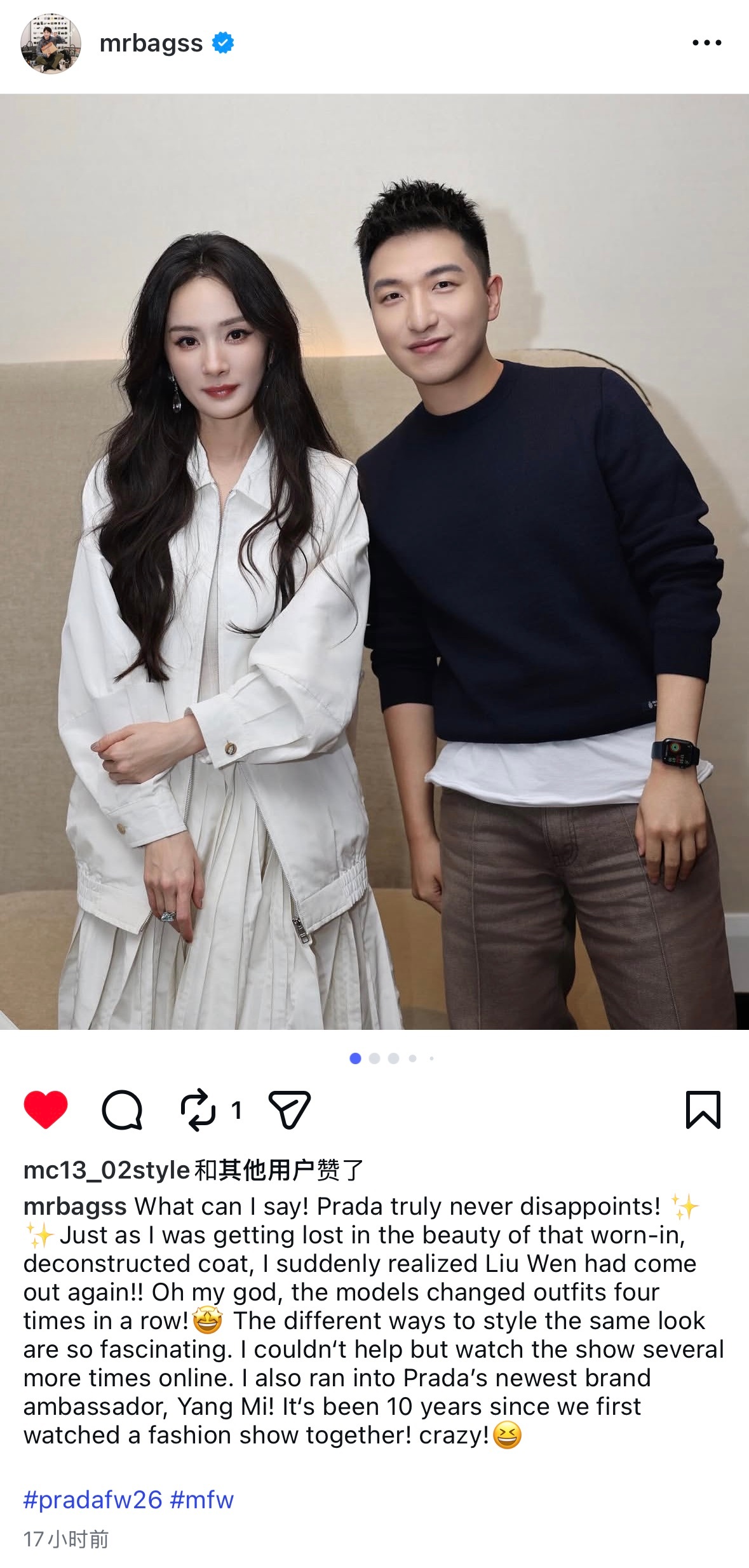 杨幂 杨幂和包先生合影包先生说在Prada秀场遇见品牌代言人杨幂,想起两人第一次一起看时装秀已经是10年前了不过合影很多啊,今年是米兰时装周Prada秀场,24年在巴黎时装周也有合影,好羡慕