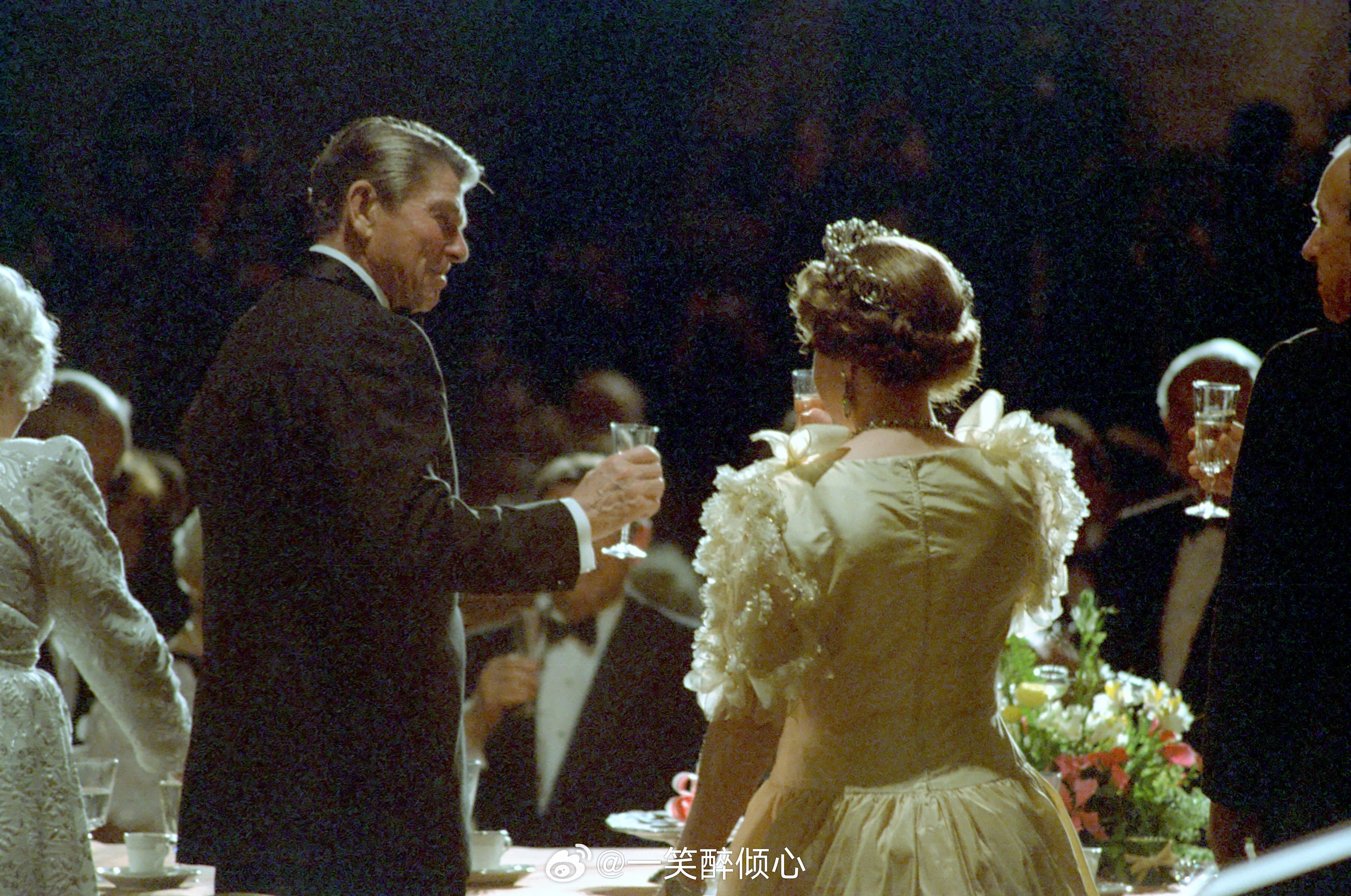 1983年3月3日,伊丽莎白二世女王在美国加利福尼亚州圣弗朗西斯科市德扬博物馆举行的晚宴上与美国总统Ronald Reagan干杯🍻🇺🇸