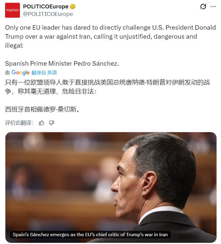 针对特朗普威胁切断与西班牙贸易关系的言论,西班牙第二副首相迪亚斯批评特朗普的相关言论“不可接受”,强调西班牙不会接受外部施压。 当天早些时候,特朗普在白宫会见德国总理默茨时说,西班牙在此次美国袭击伊朗的军事行动中,拒绝美国使用其军事基地。 而在所有欧盟领导人中,只有西班牙首相佩德罗·桑切斯敢于直接对特朗普就针对伊朗的战争行为提出质疑,他认为这场战争是不正当的、危险的且是非法的。